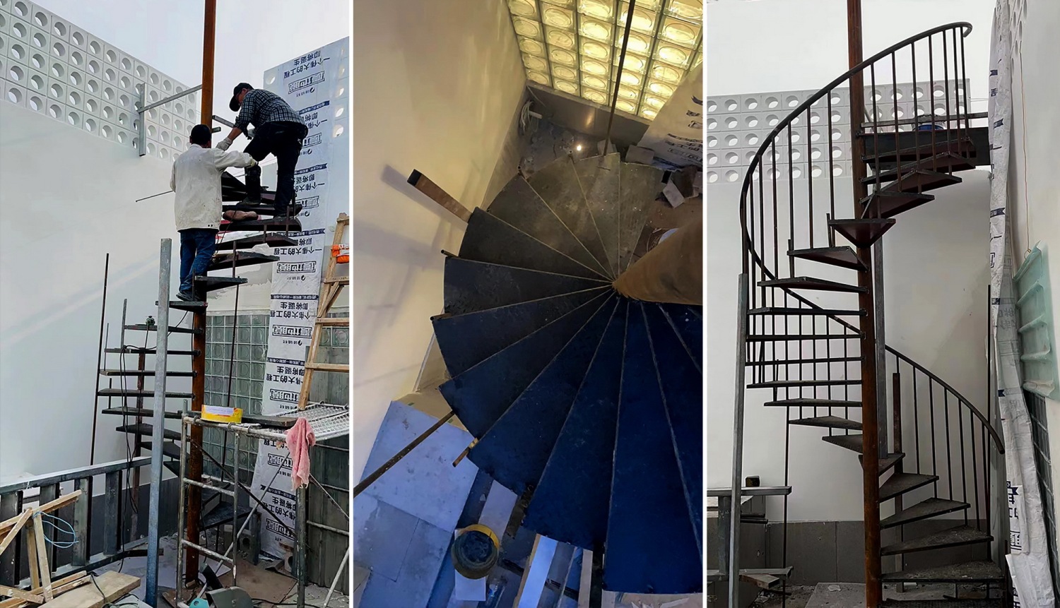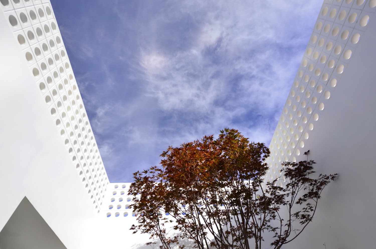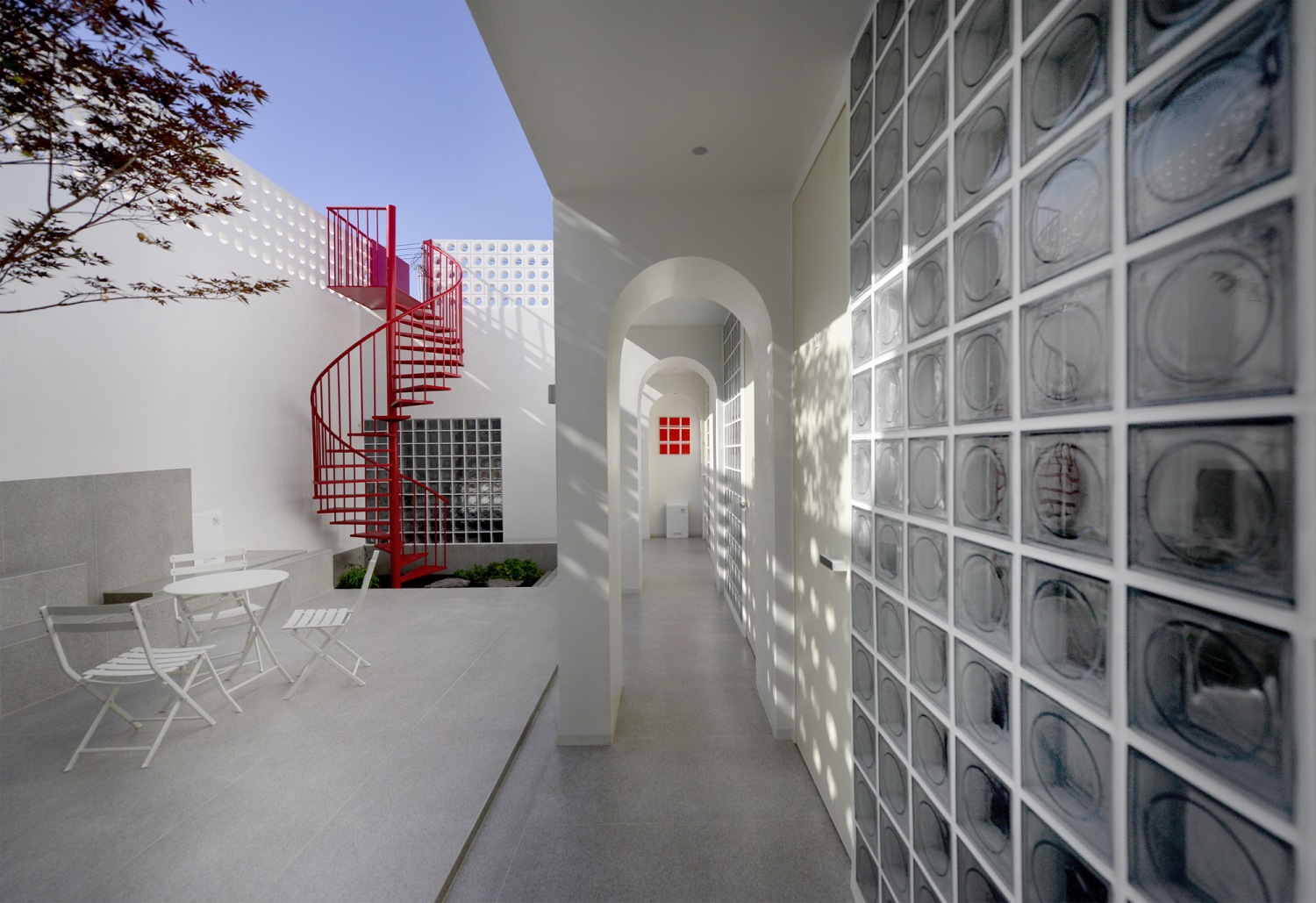 Passing through the public area and entering the courtyard, the entire building embraces the courtyard in a circular manner: a sunken observation fish pond, a circulating water landscape, a rotating staircase that leads directly to the roof platform, and the swaying red maple trees are completely surrounded by the building. The inner courtyard is isolated from the outside world, far away from the hustle and bustle of the city. The elevated parapet wall enhances the centripetal nature of the enclosed space and creates a unique sense of belonging.