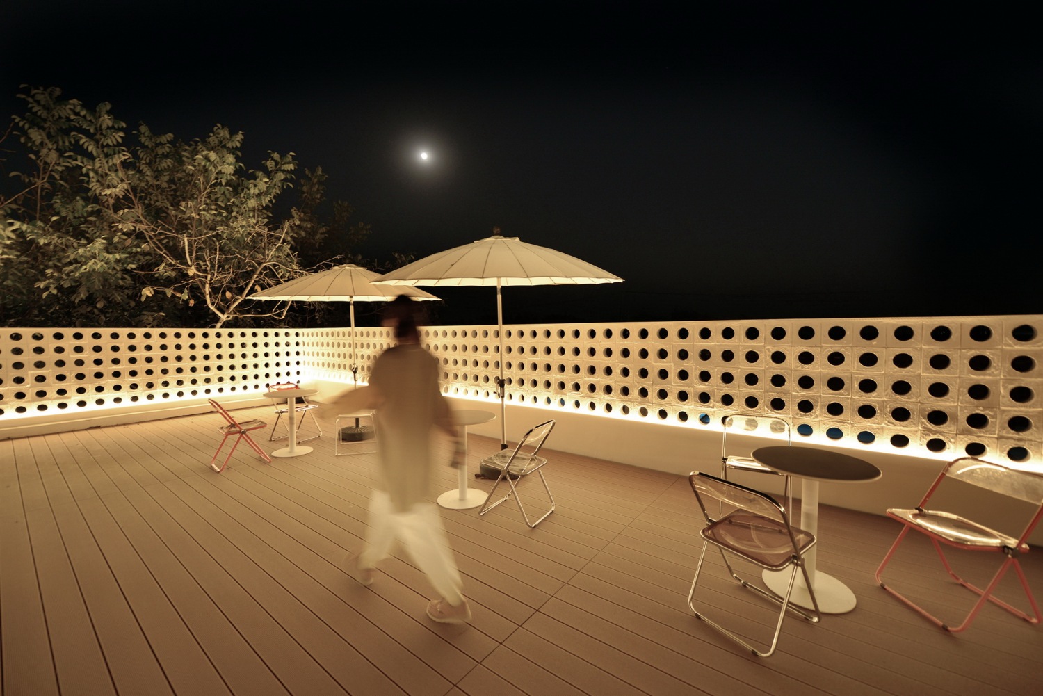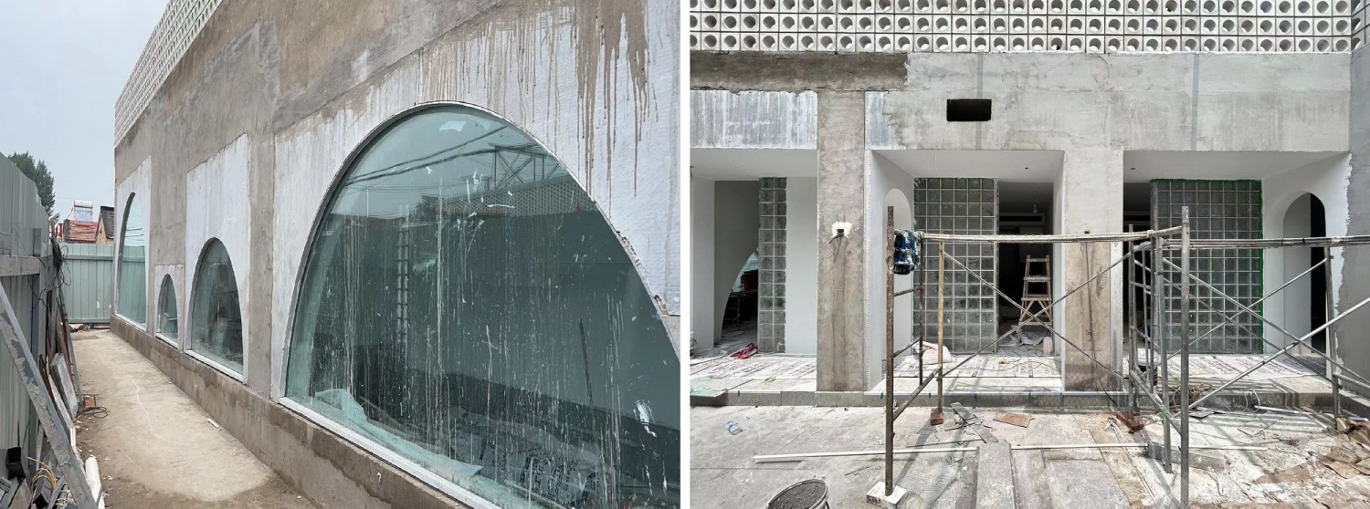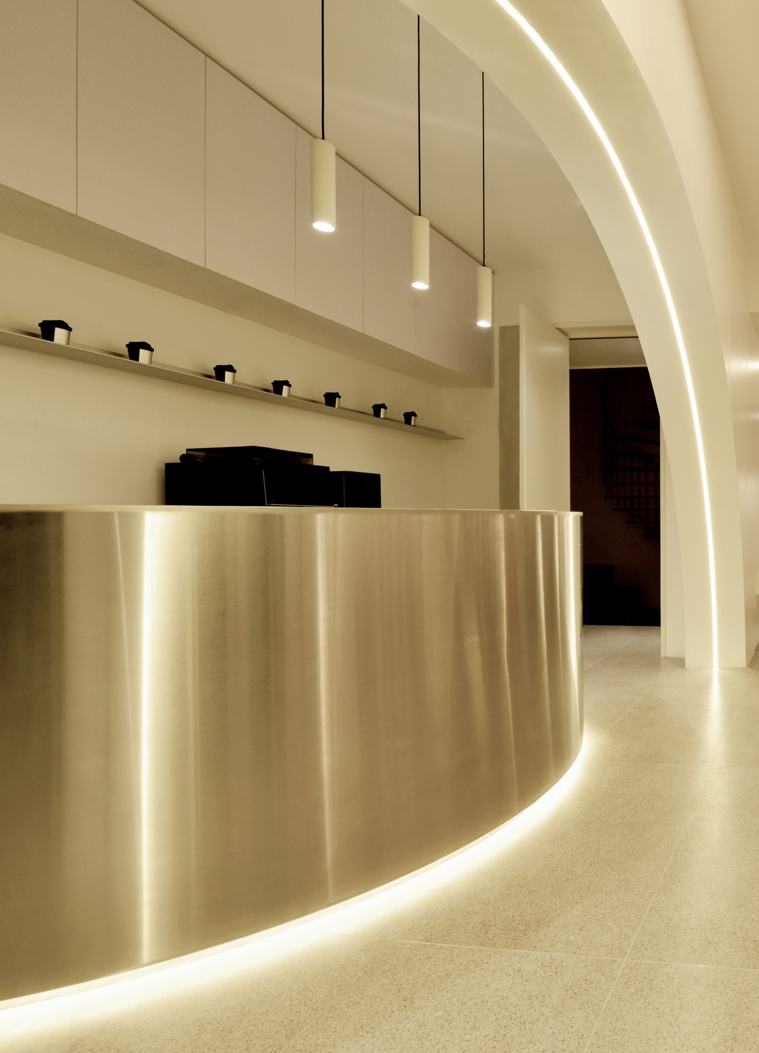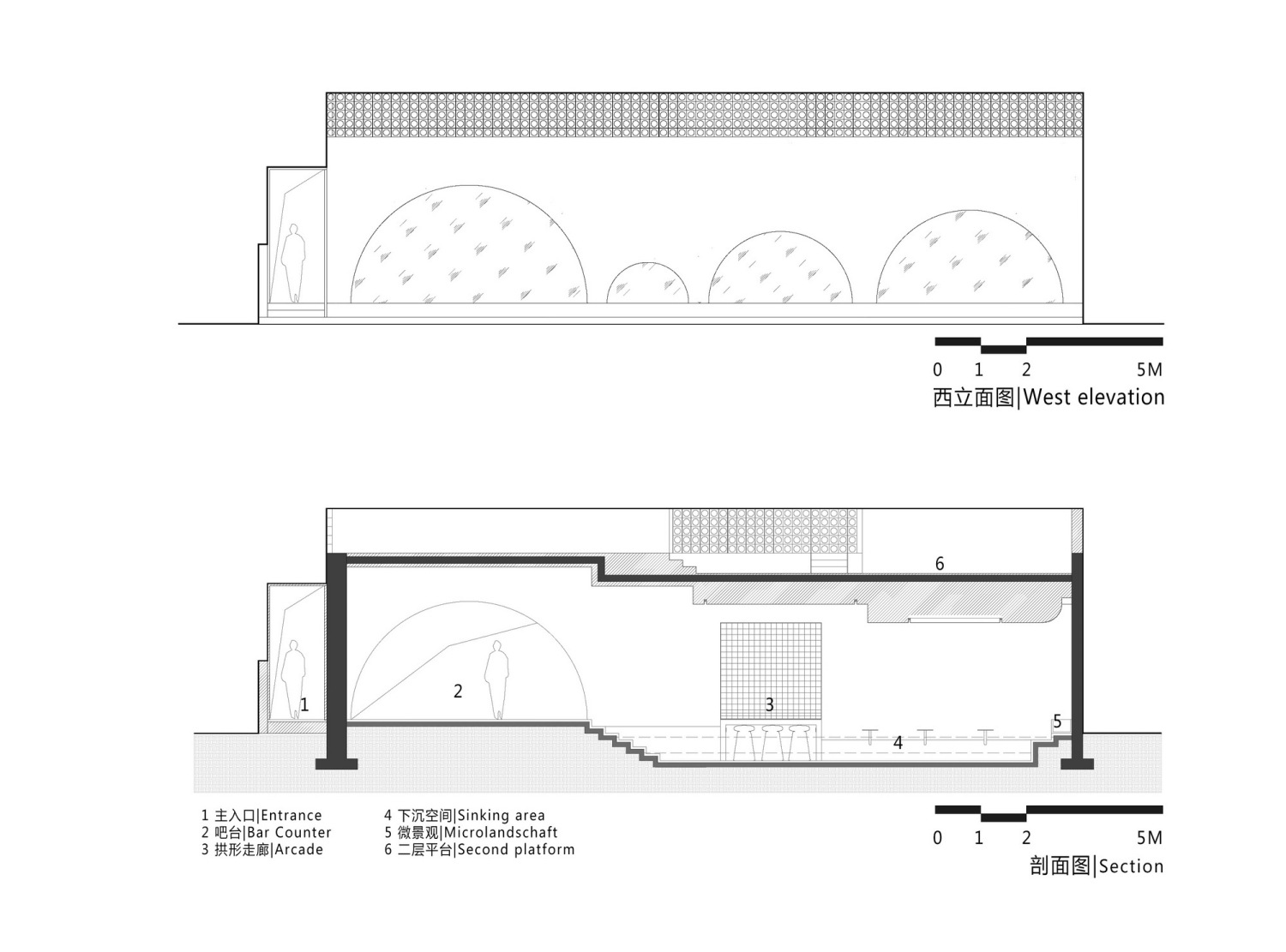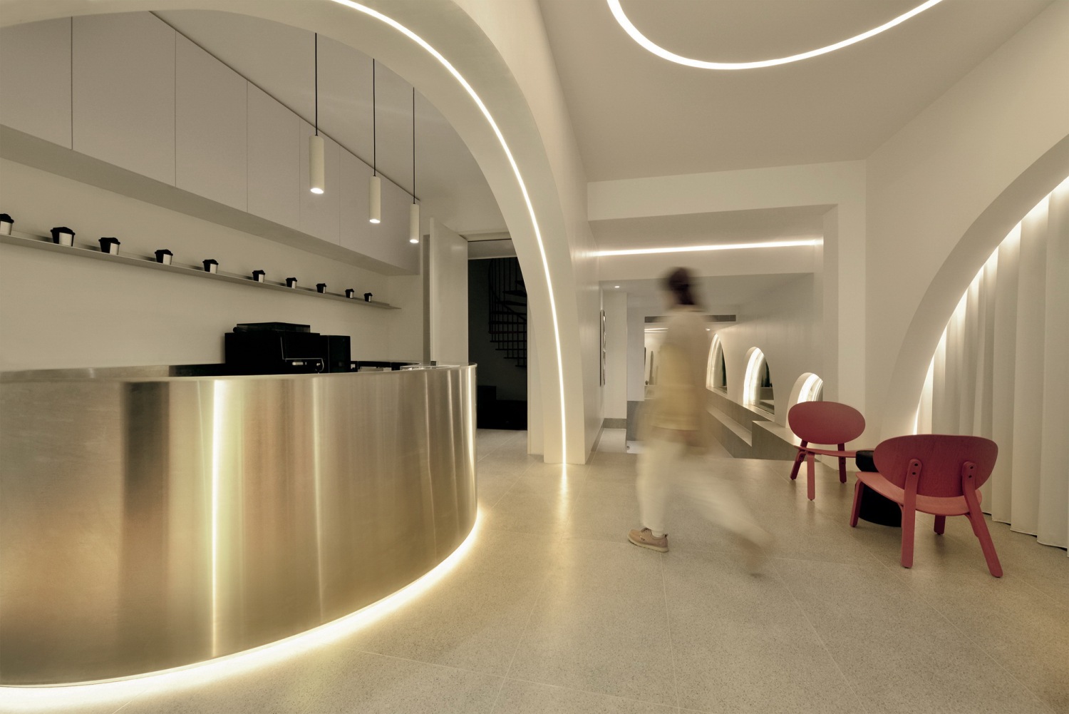 The public space uses the difference in the height of the suspended ceiling to raise and dig down the ground, increasing the hierarchical texture of the linear space. The interior arc elements such as the suspended ceiling, lighting, and bar counter are unified with the arc window of the exterior facade. The properly sunken booth area ensures a direct view of the outside.