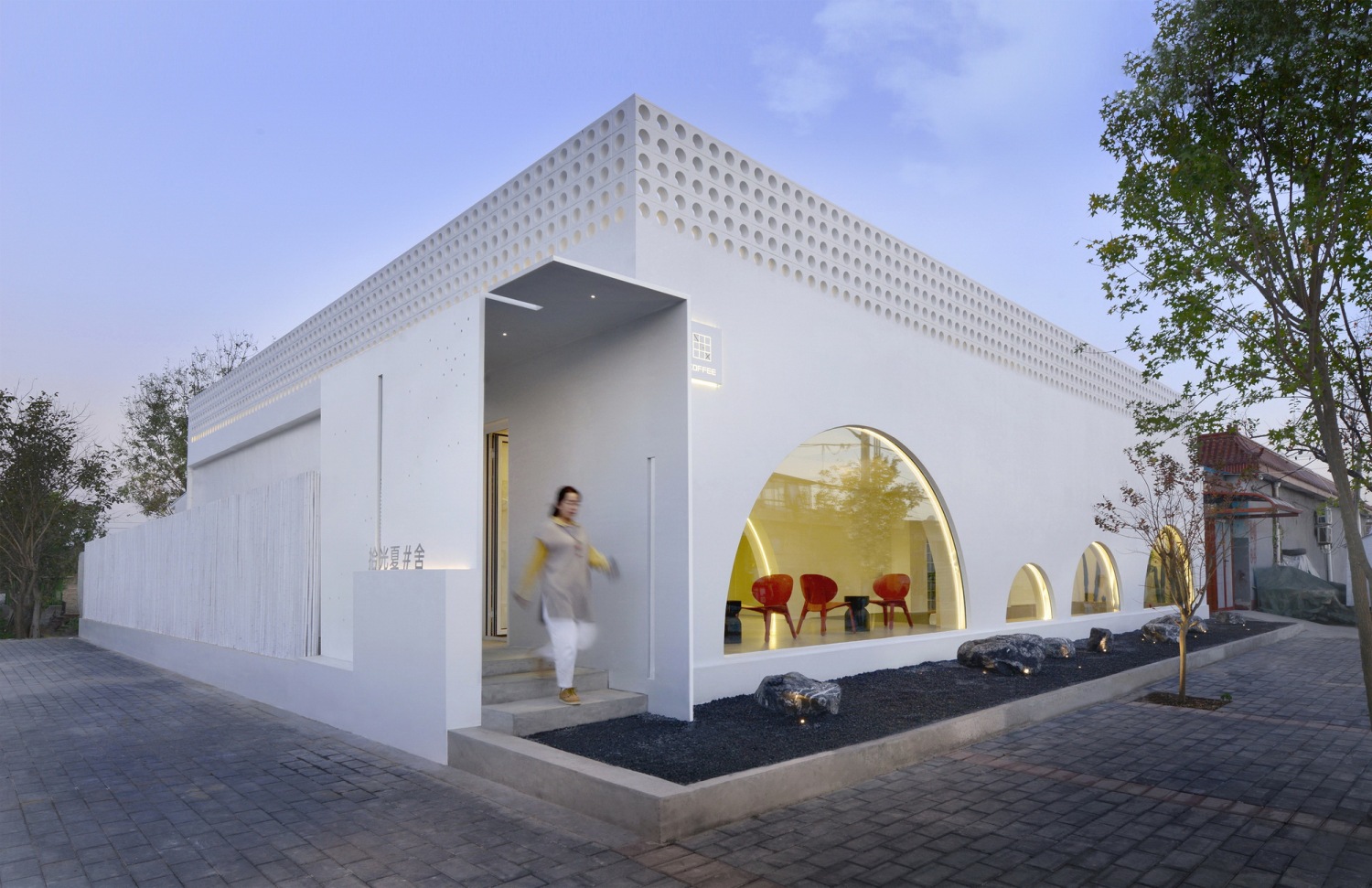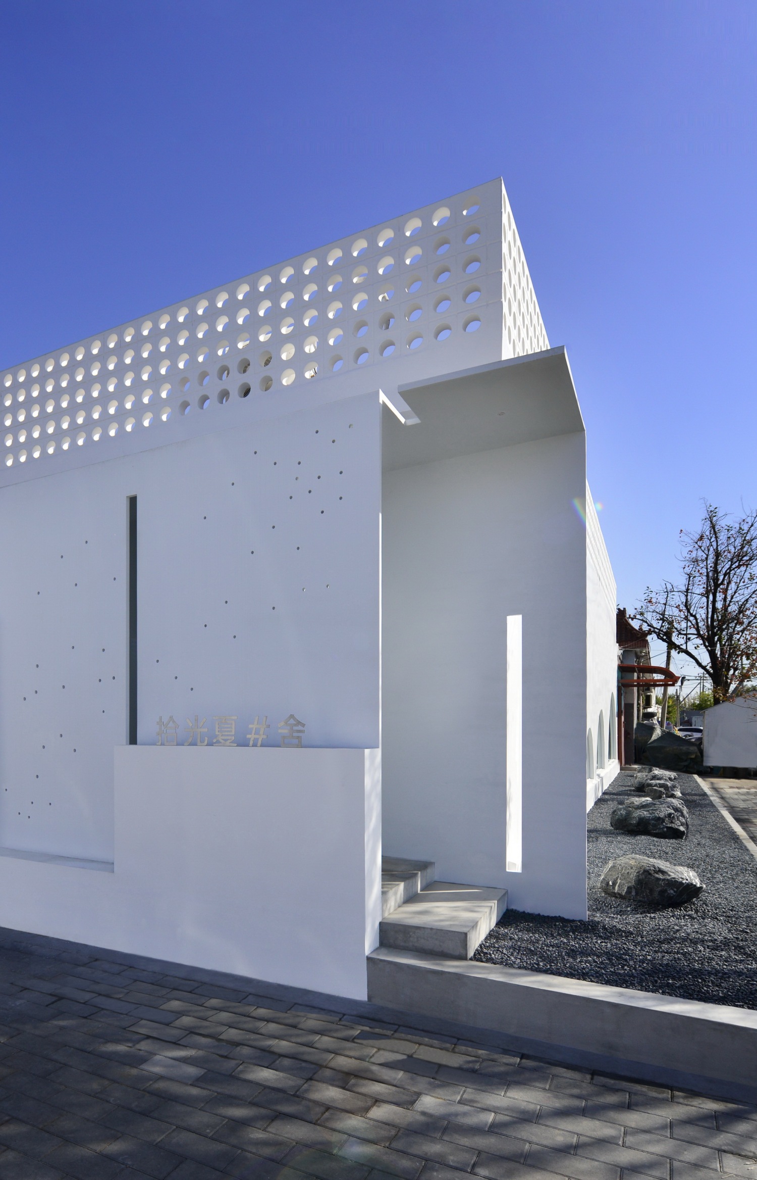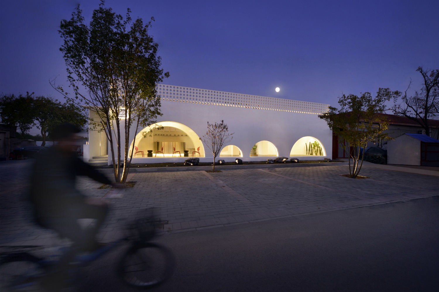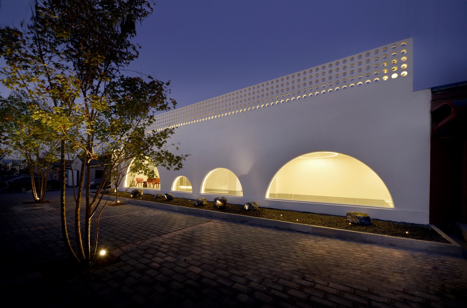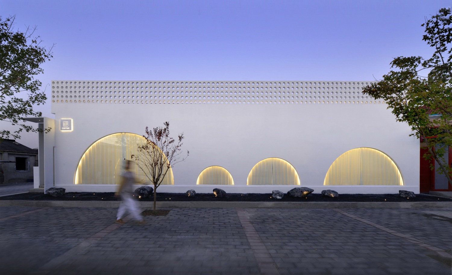 形式上纯白的方盒子成为此地最具标示性的元素,依托空间内部的划分,沿街西立面采用四个大小不一的拱形采光窗,西侧广场上的三颗元宝树成为夕阳映射到建筑立面的光影画笔,灵动的枝叶透过拱形窗直达室内。落日余晖使建筑立面蒙上一层金色,熠熠生辉。