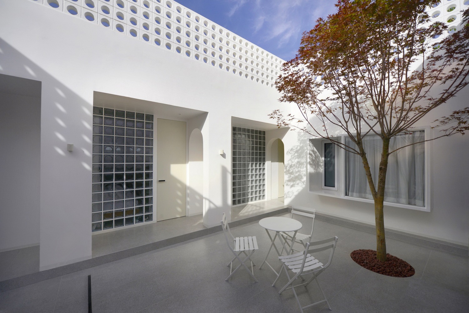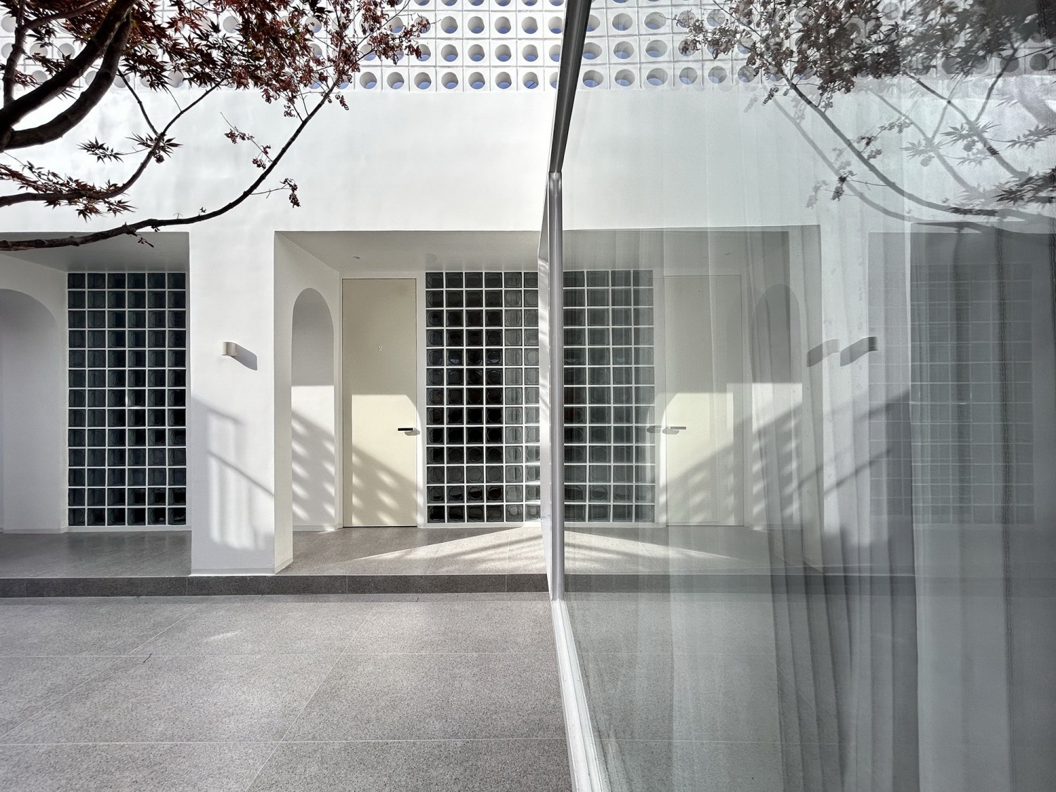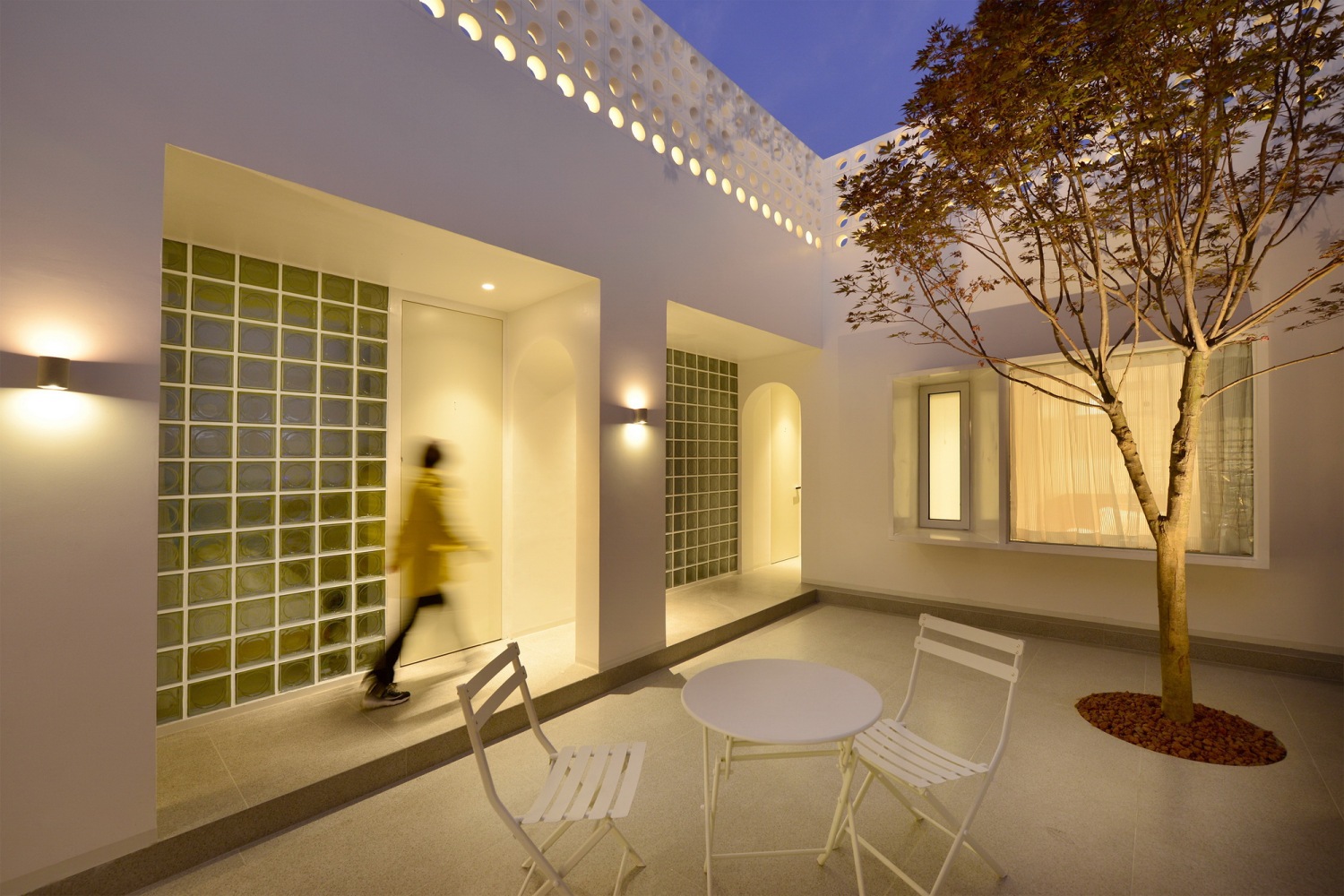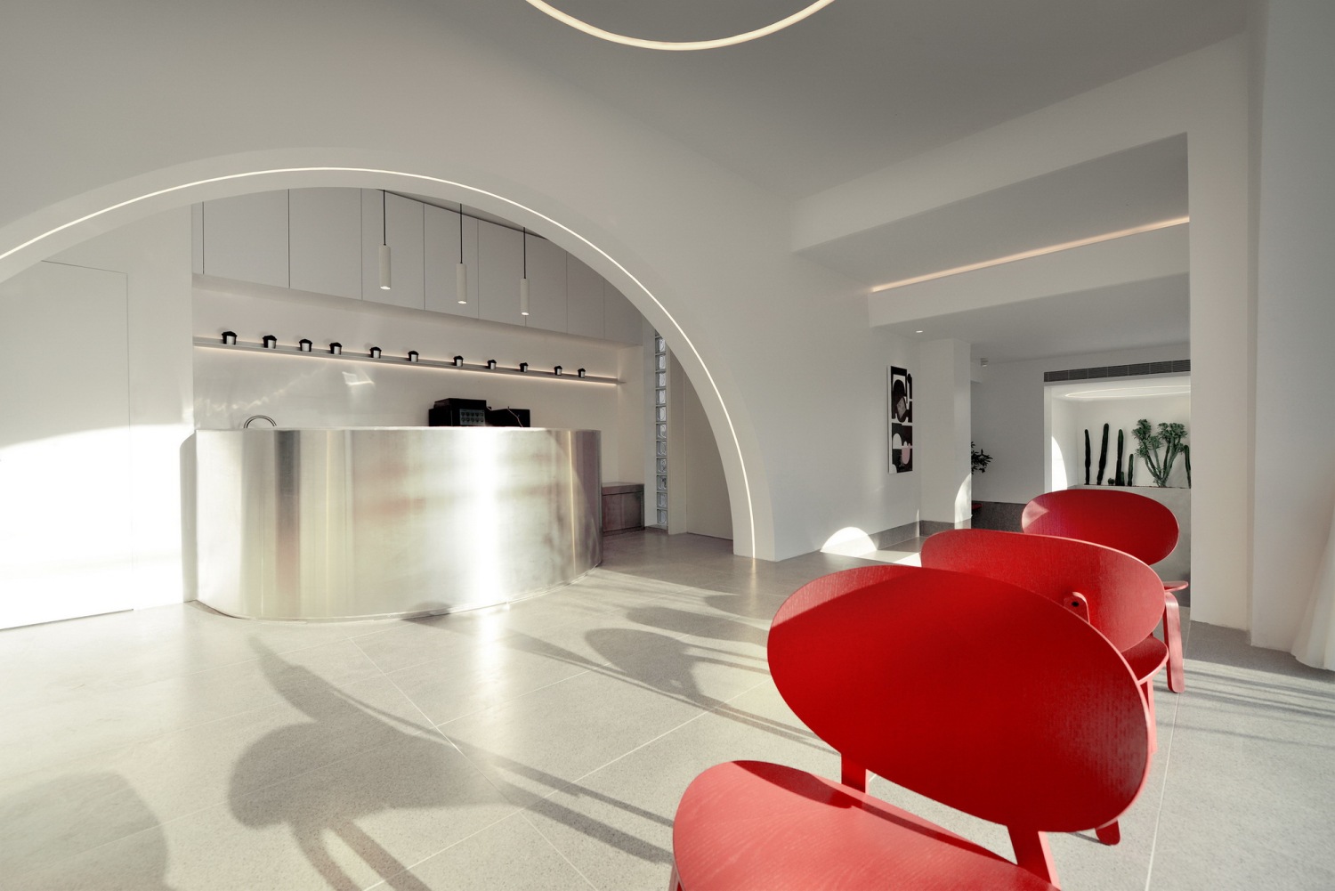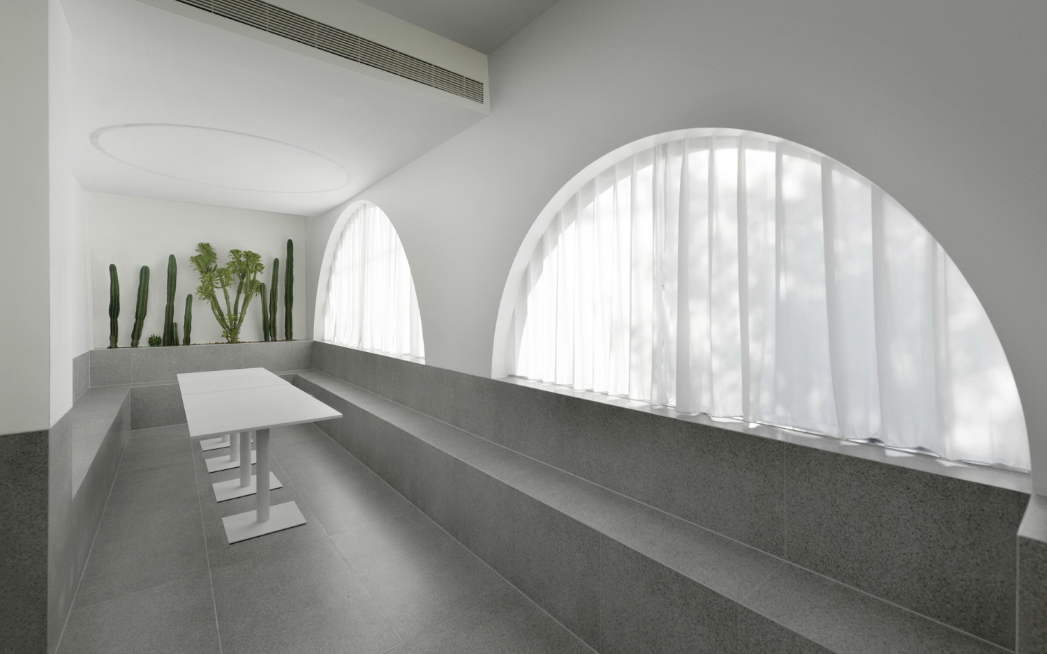 形式上纯白的方盒子成为此地最具标示性的元素,依托空间内部的划分,沿街西立面采用四个大小不一的拱形采光窗,西侧广场上的三颗元宝树成为夕阳映射到建筑立面的光影画笔,灵动的枝叶透过拱形窗直达室内。落日余晖使建筑立面蒙上一层金色,熠熠生辉。