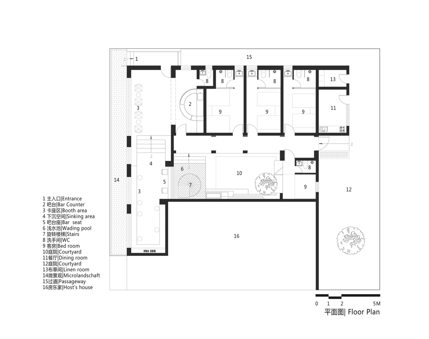 建筑改造整体划分为两部分:公共空间及住宿区,考虑二者的动静管理,在建筑入口规划可直达客房的流线,使二者既互相独立又相互联系。作为村落沿街的公共空间,该区域布置水吧成为社区功能的一部分。