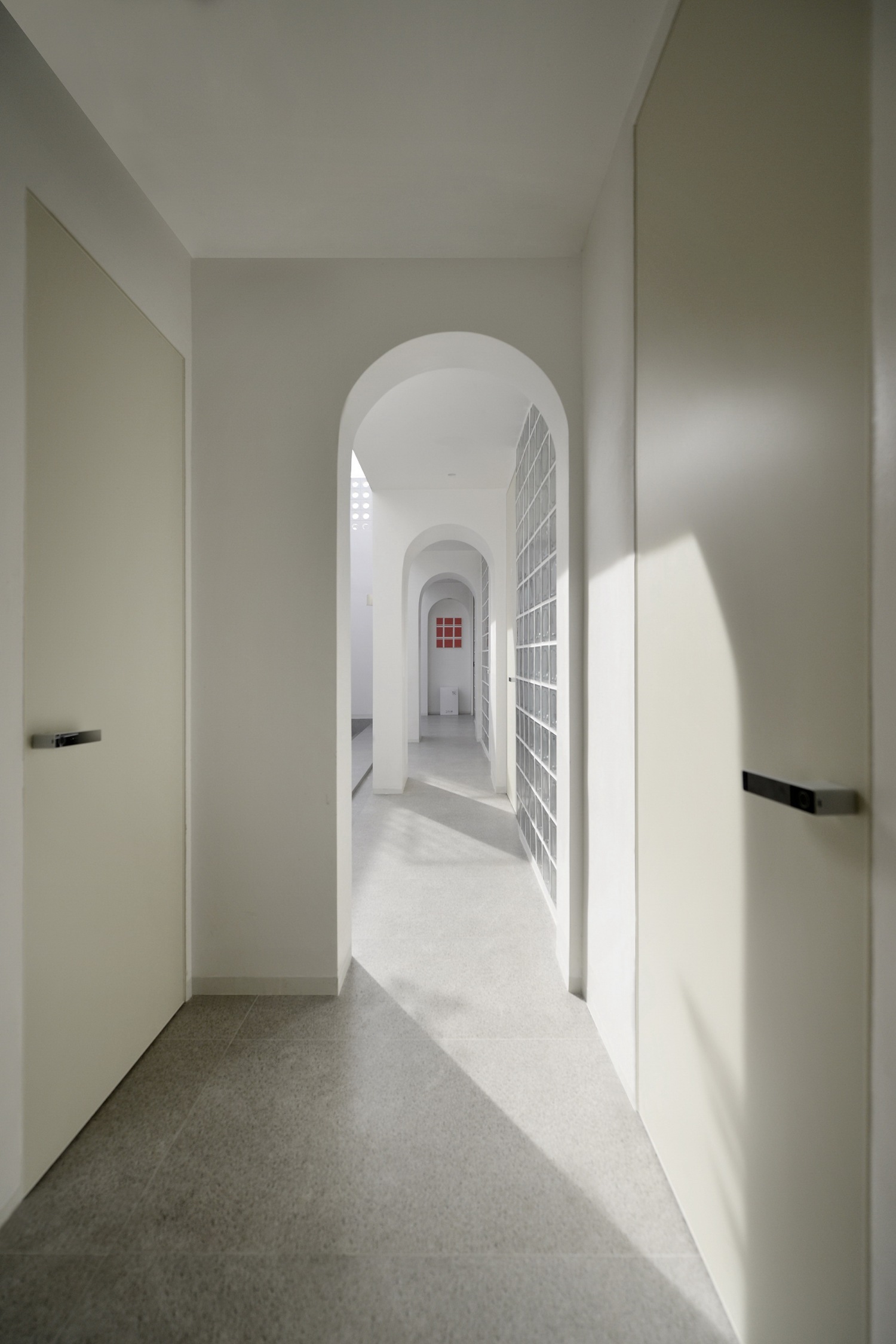 The white square box becomes the most symbolic element here. Relying on the internal division of the space, four arched lighting Windows of different sizes are adopted along the west facade of the street. The three ingot trees on the west square become the light and shadow brush of the sunset mapped to the facade of the building, and the shadow reaches the interior through the arched window. The setting sun gave the building a golden glow.