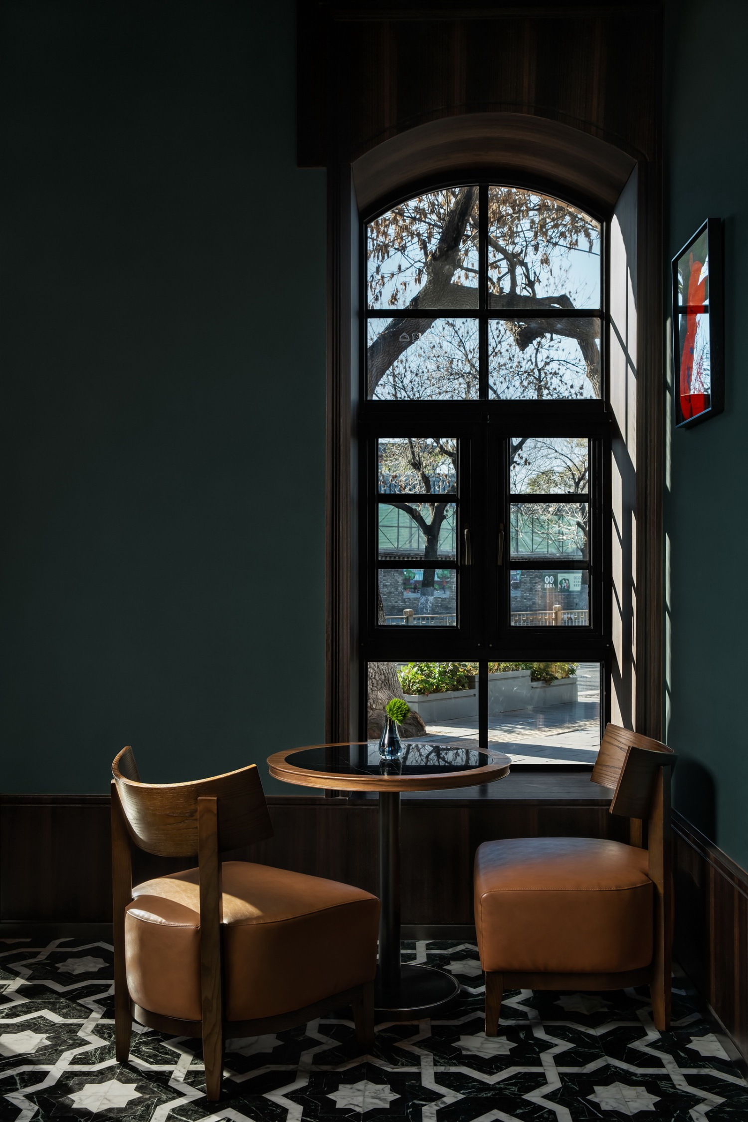 菱格门窗之后是幽然的雪茄室,砖砌的格栅窗台配合燃起的壁炉,深邃如洞穴。待行至二层迎客的吧台,火光纹路的天然大理石台面,如同炉火,烘焙着热烈与微醺。