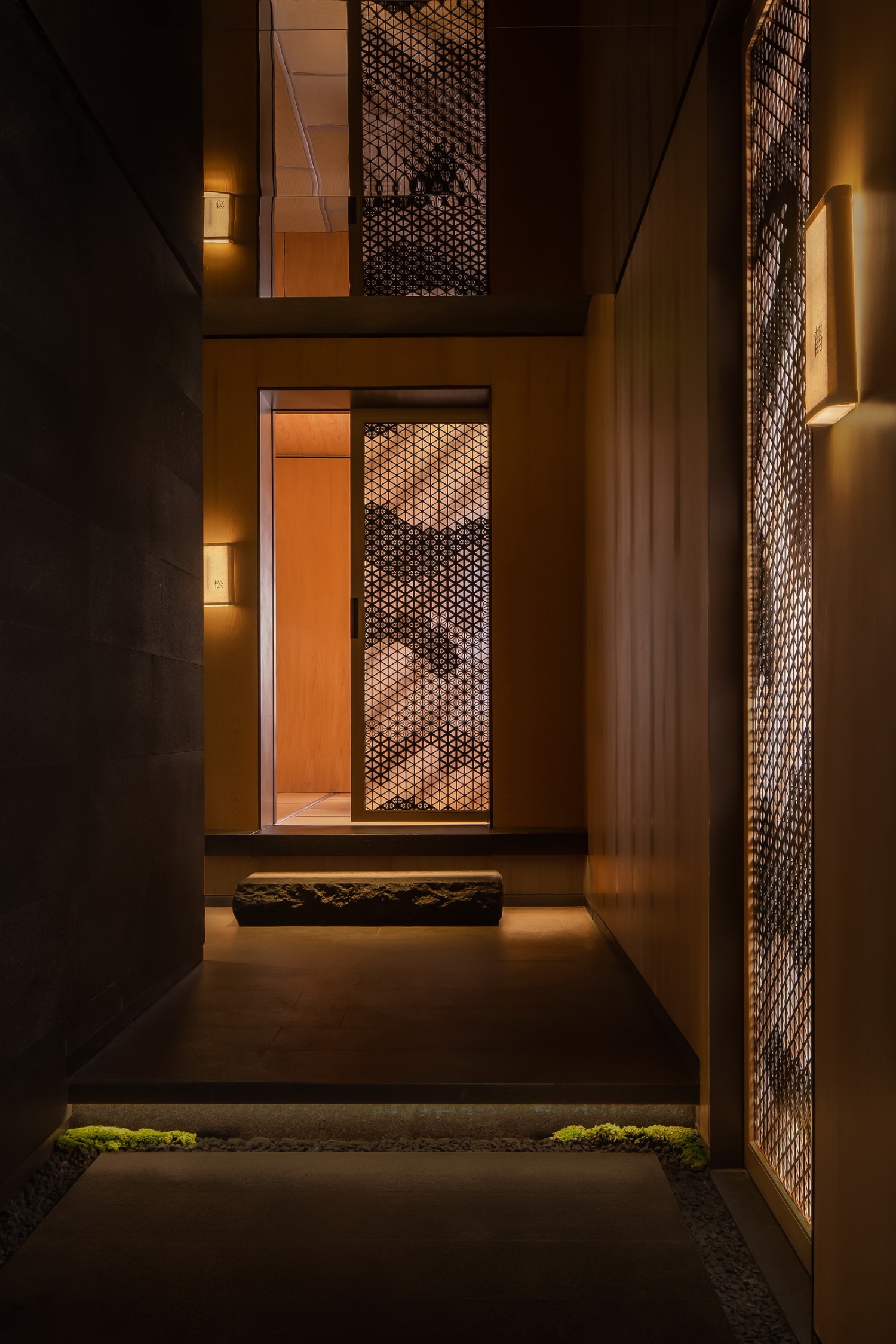 而转身处的纸窗微光造型与山石般的粗粝墙面相诙谐,加之角落里侘寂的苔藓植物,还有一带涓细的“山涧”流淌而下......仿若登高至此,身在山寺。而这种流动的空间体验,正是一种属于,中国建筑的空间美。