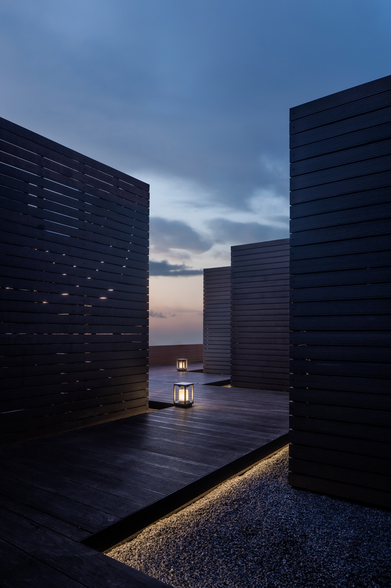 设计的最终,是联结人与自然。鮨膳的空中院落,即是在一方 空间中,令天地、植树自成一世界。顺着屋顶蜿蜒的木廊道,即可抵达四方的下沉式庭院, 枫树与竹环绕周围,不规则的石板小径穿插其间,炉火燃气,围聚小酌,其乐融融。