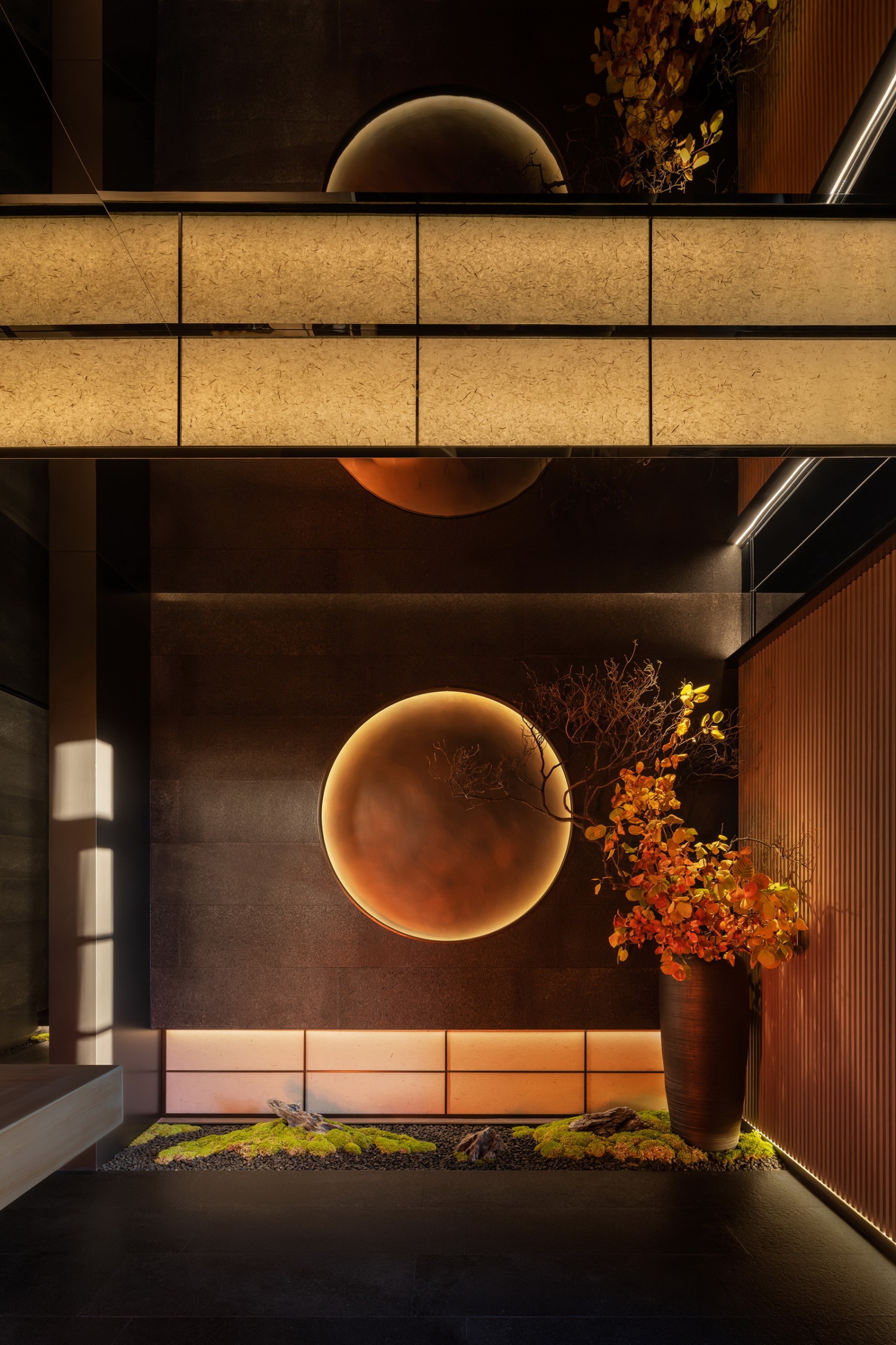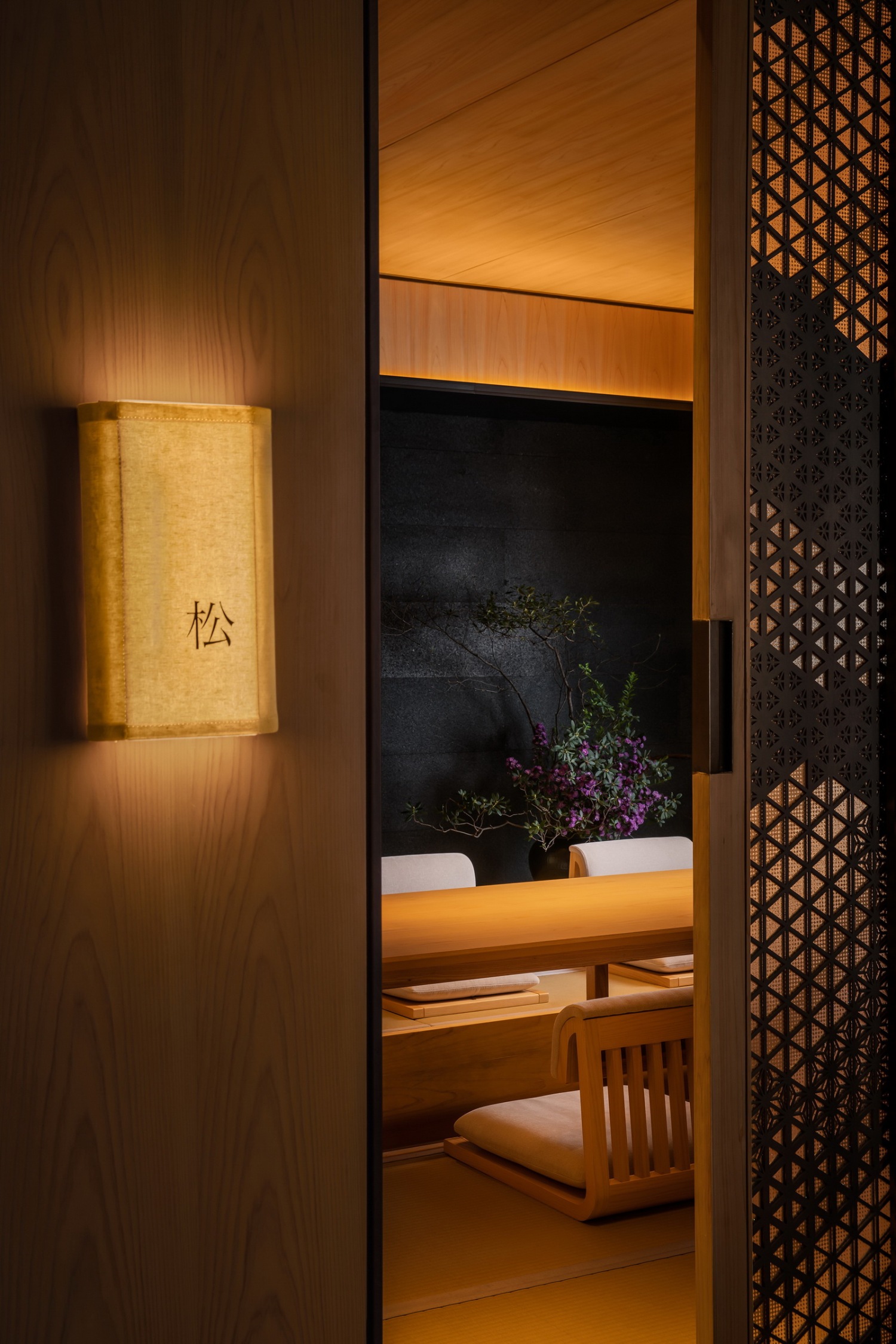 若细心体察,就连每一扇隔挡的窗棱,都有松与枫的镂空雕花,影影绰绰;角落中的草木花道,与墙面的圆月造型,造就疏朗气质。