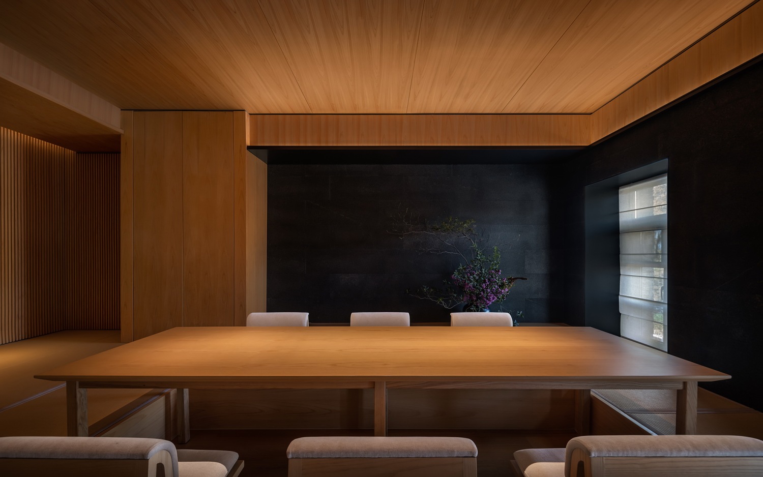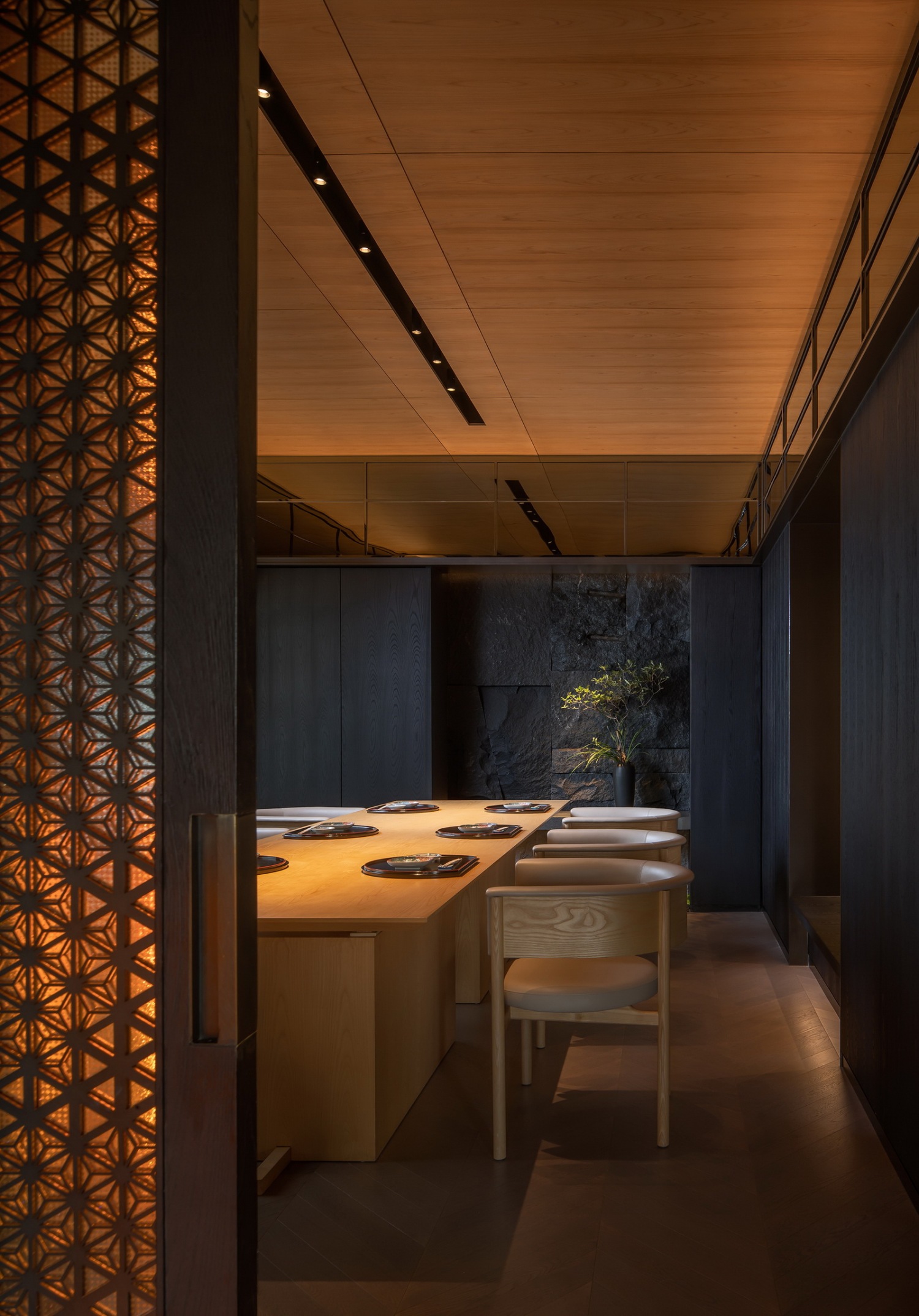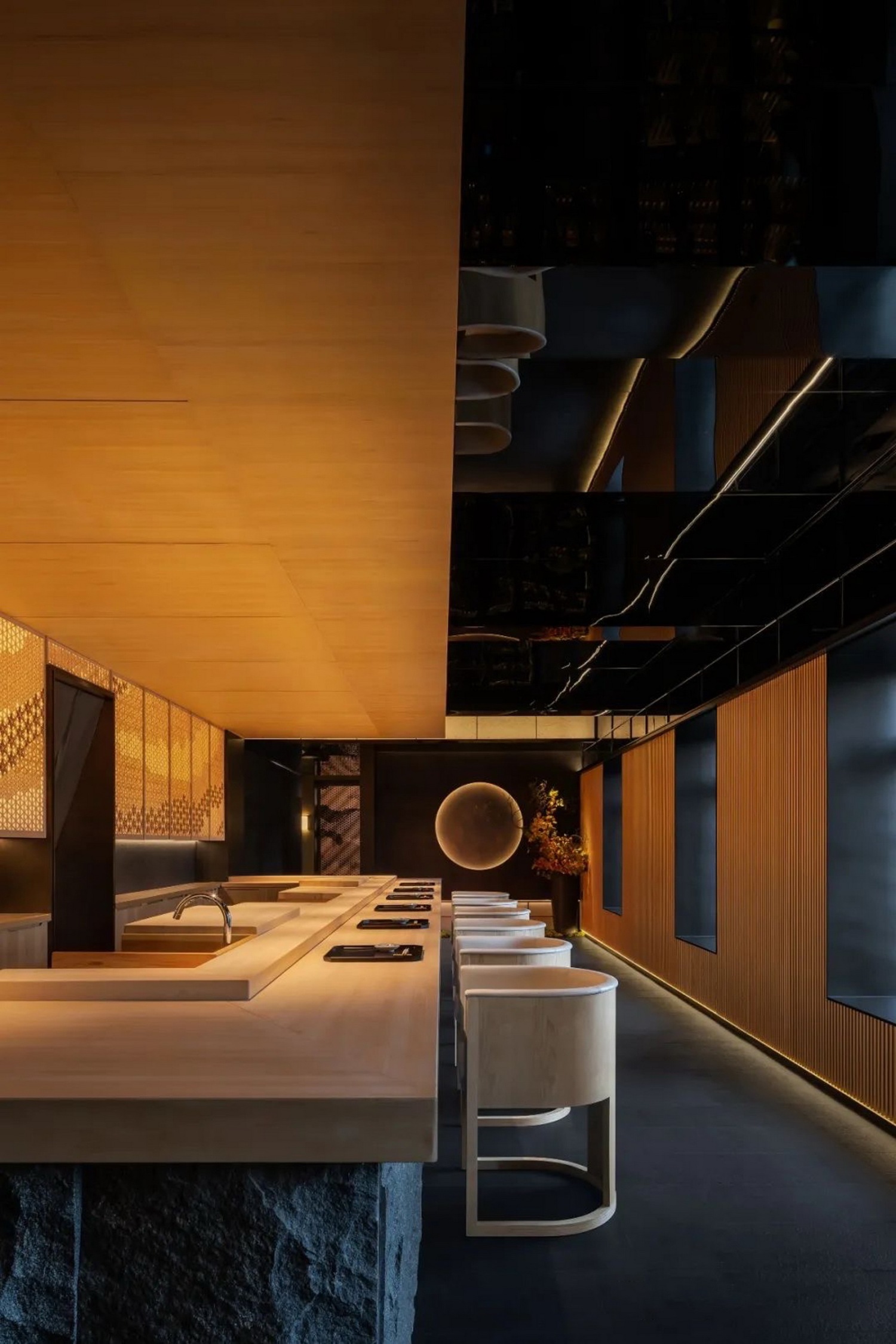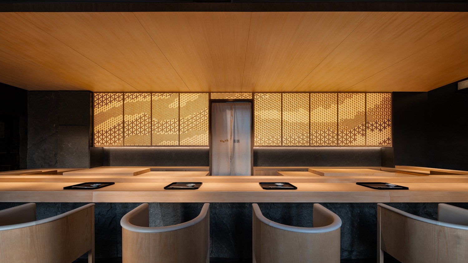 最终,所有造境与动线将访客聚合于空间中央的板前。宽大的桧木案台,配圆椅、布帘、影窗,更有曾在2017年获授亚洲十大名厨的铃木民夫,就在这里将山野美味割烹料理。