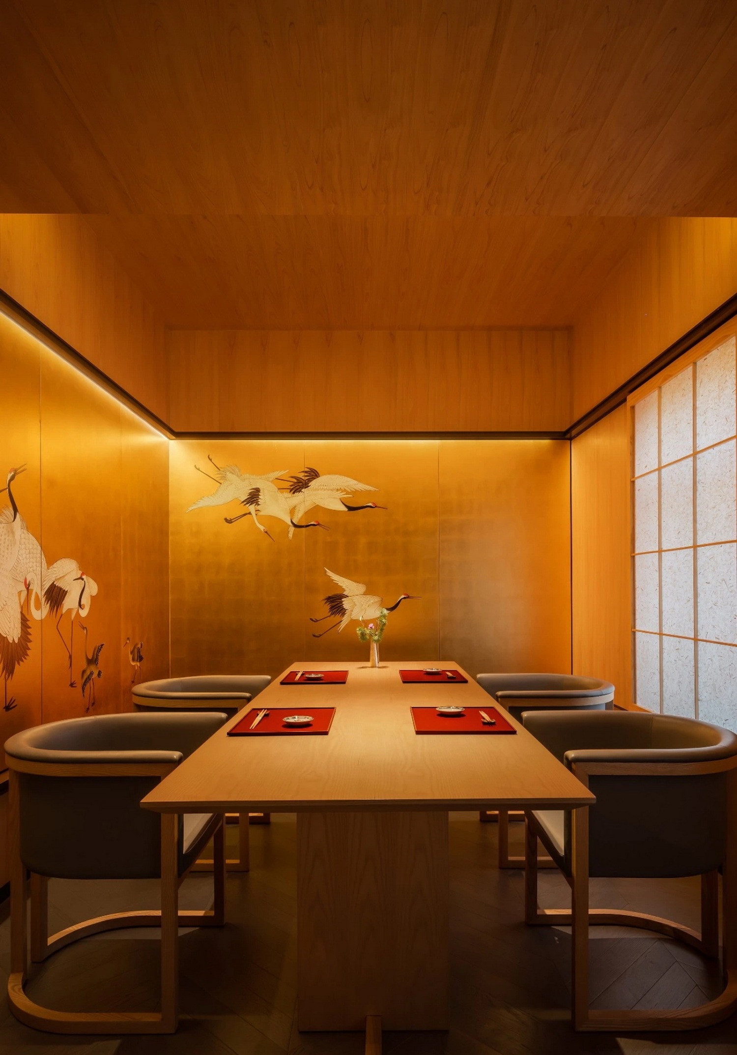 金与原木的主色调,静默雅致,宴席之外也可举办小型艺术展,是内城中难得的私享聚会之所。