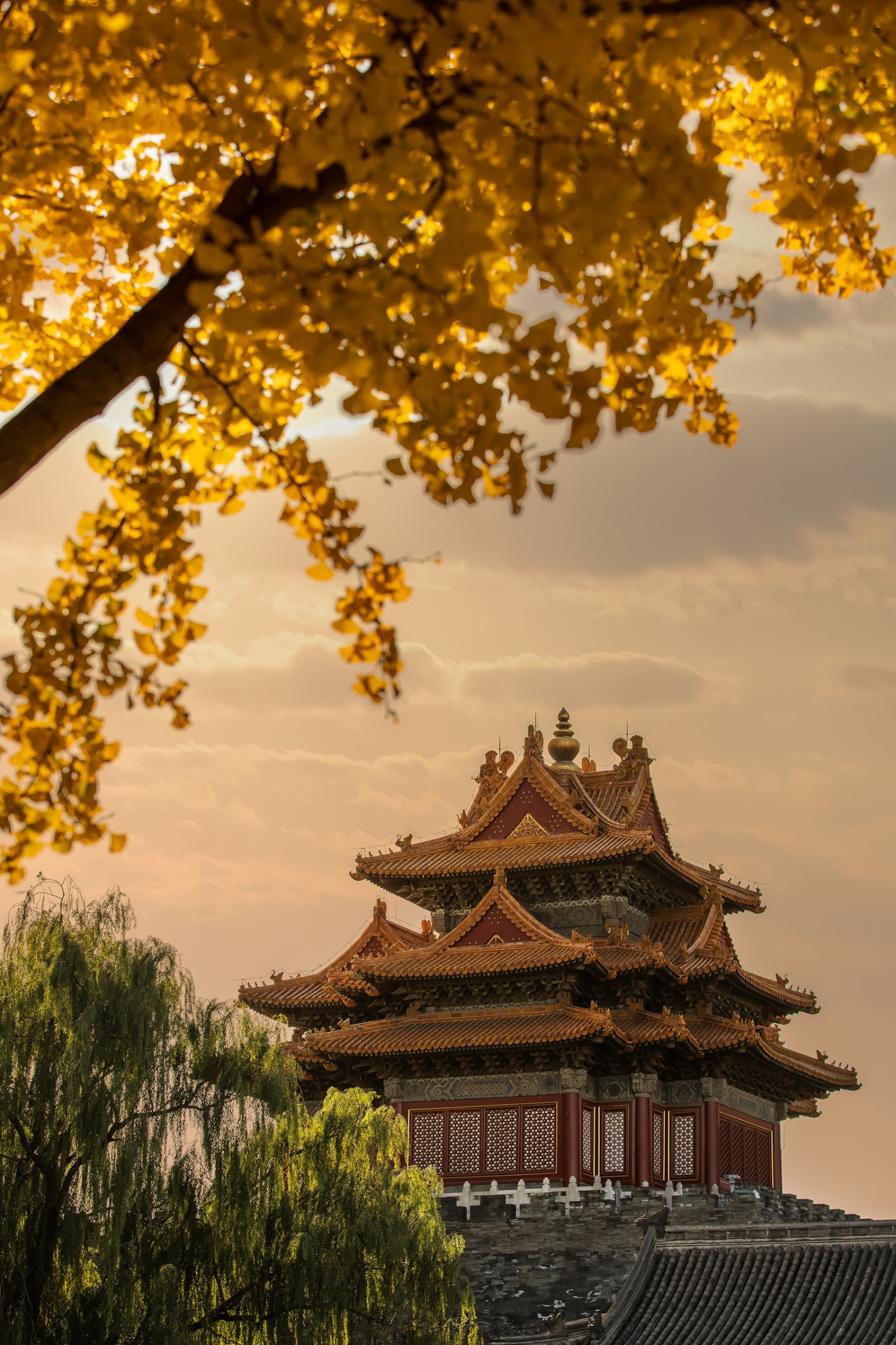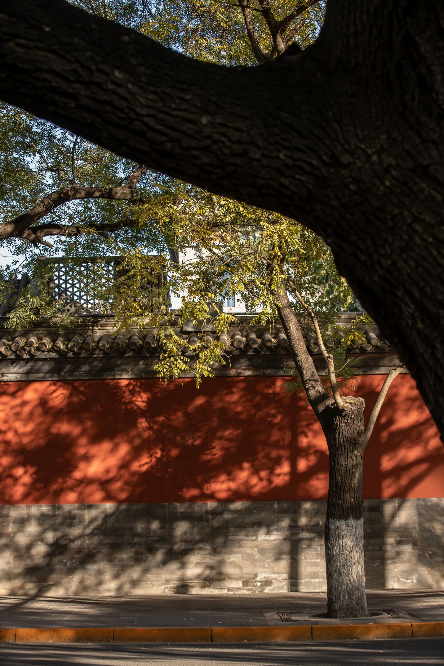 透过眼前繁盛的老树枝桠,可望见对面的故宫角楼——歇山顶有横有竖、有露有藏,檐角错落有致、高低自如,展现着皇家建筑的威仪。