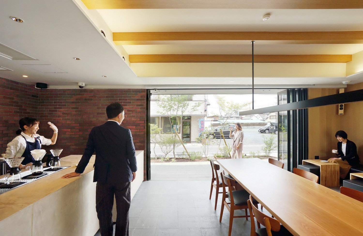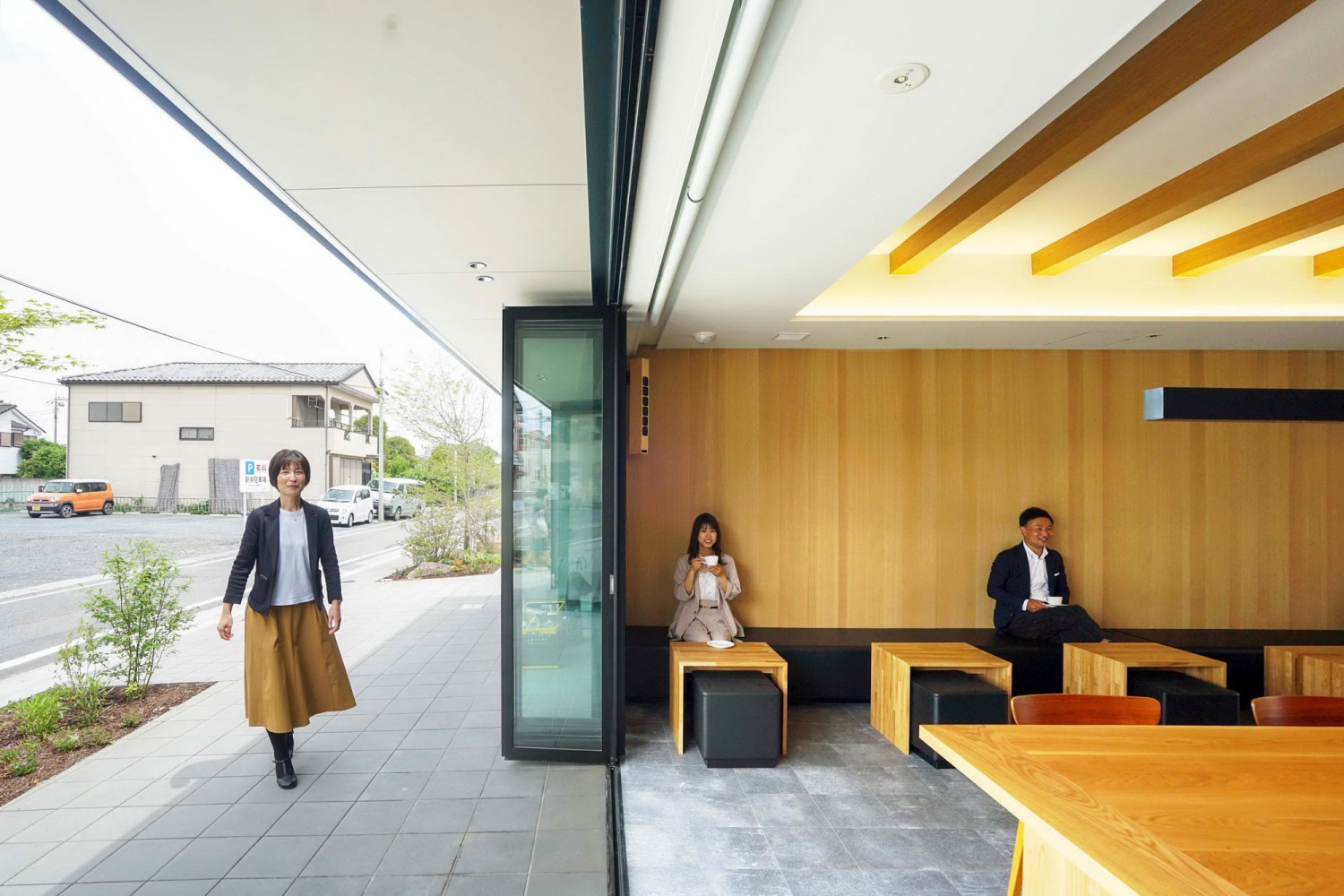 面朝大路就像真正的咖啡店一样让当地人能随时轻松前往使用的开放式空间,让原本有距离感的设施使人更容易亲近。大多数儿童发育支援设施都是在建好的大楼内经简单改造装修而成,为了保护隐私容易形成闭塞的环境。在设施各处设置了能照顾到使用这里成长发育需要援助的孩子们的感受的场所,作为孩子们成长所必要的活动环境,有意识的和当地社会联系紧密,外部街道能看到设施庭园和内部活动的同时,也在设施前方栽种了植被营造出恰当的开放感。