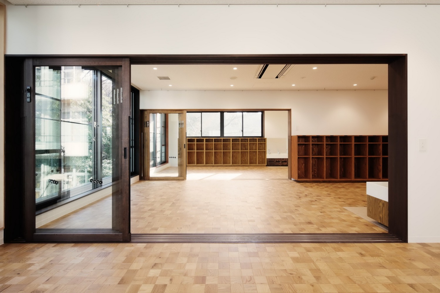 容易变得封闭的指导训练室面朝道路敞开,孩子们能从室内看到外面的街道,室外的人也能瞧见室内活动的样子。连接庭园的餐厅,设置了全开放式的推拉玻璃门,能从餐厅欣赏到前方气比神宫的绿意。孩子们在舒适的开放性空间生活的同时,也能感受到和附近区域环境以及居民的羁绊。