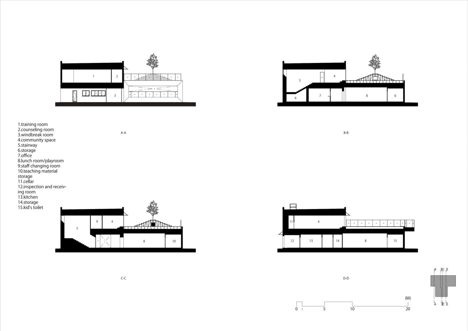 公共空间用当地泥土制作了三种种类的土墙。外墙砖,木地板采纳了具有当地特色的建筑和植物的颜色和花纹。隔扇,边框,家具随机配色得以更自然地融合。孩子们有机会观察触摸各种各样的素材,对故乡也感到更加亲切和眷恋。
