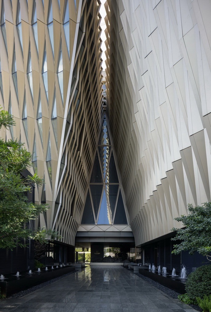 格栅化作抽象的坡屋顶,水聚天心,