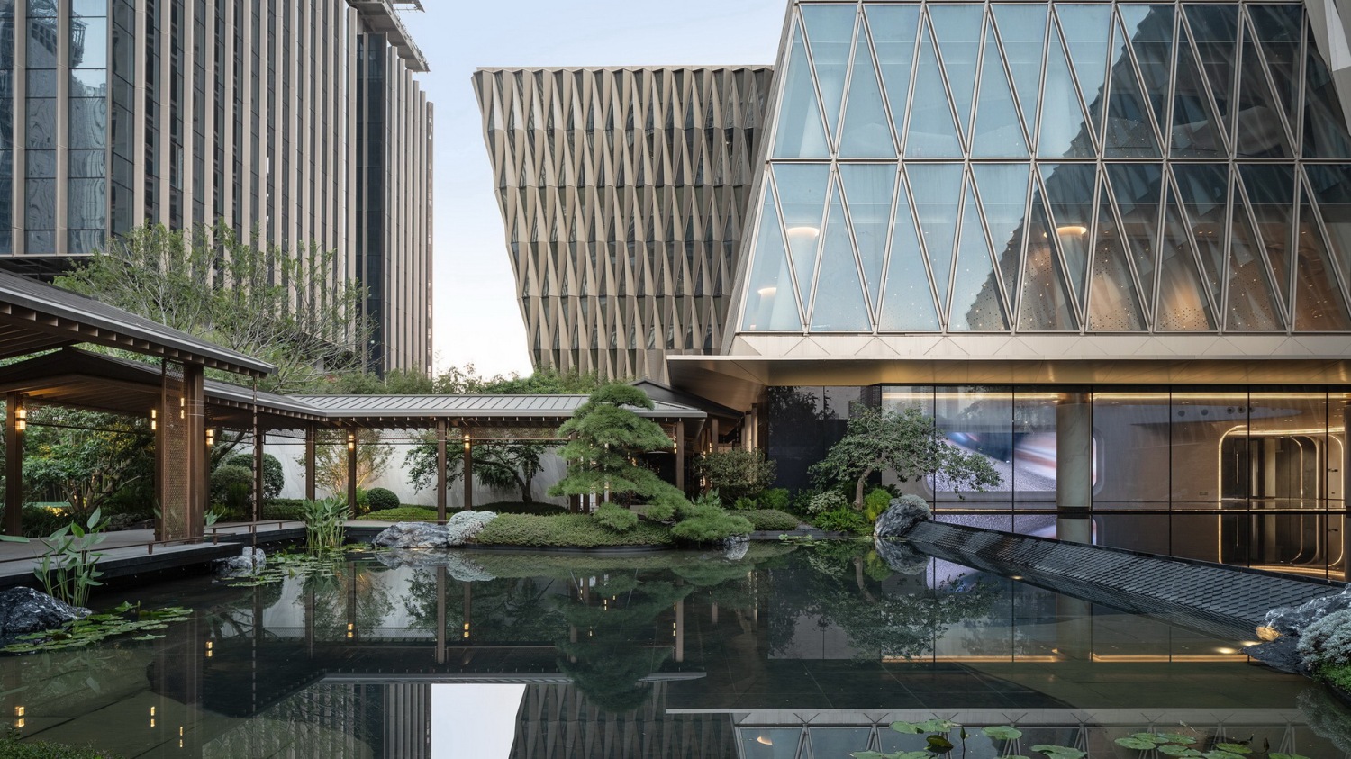 Latticed screens form abstracted sloping roofs, water gathers at the heart,