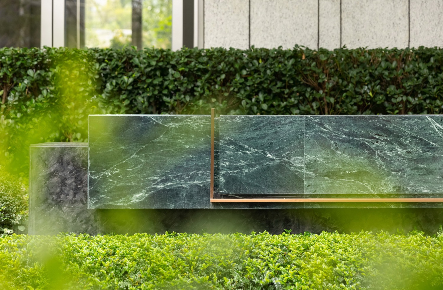 水吧台翡翠理石与电镀金属碰撞,当代工艺将艺术与社区生活相融。园景成为了吧台区域的天然背景,更好的满足了社交场景需求。