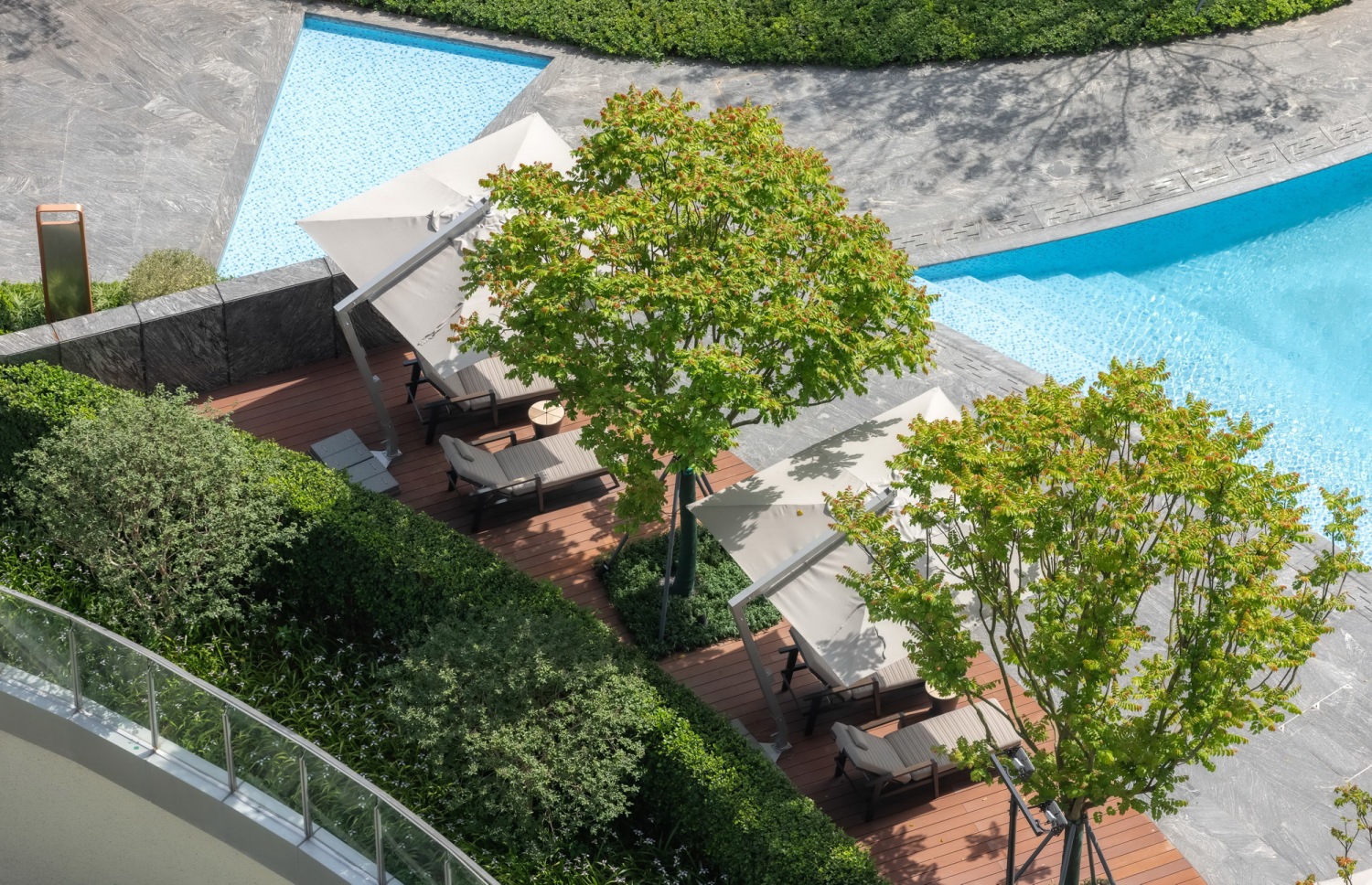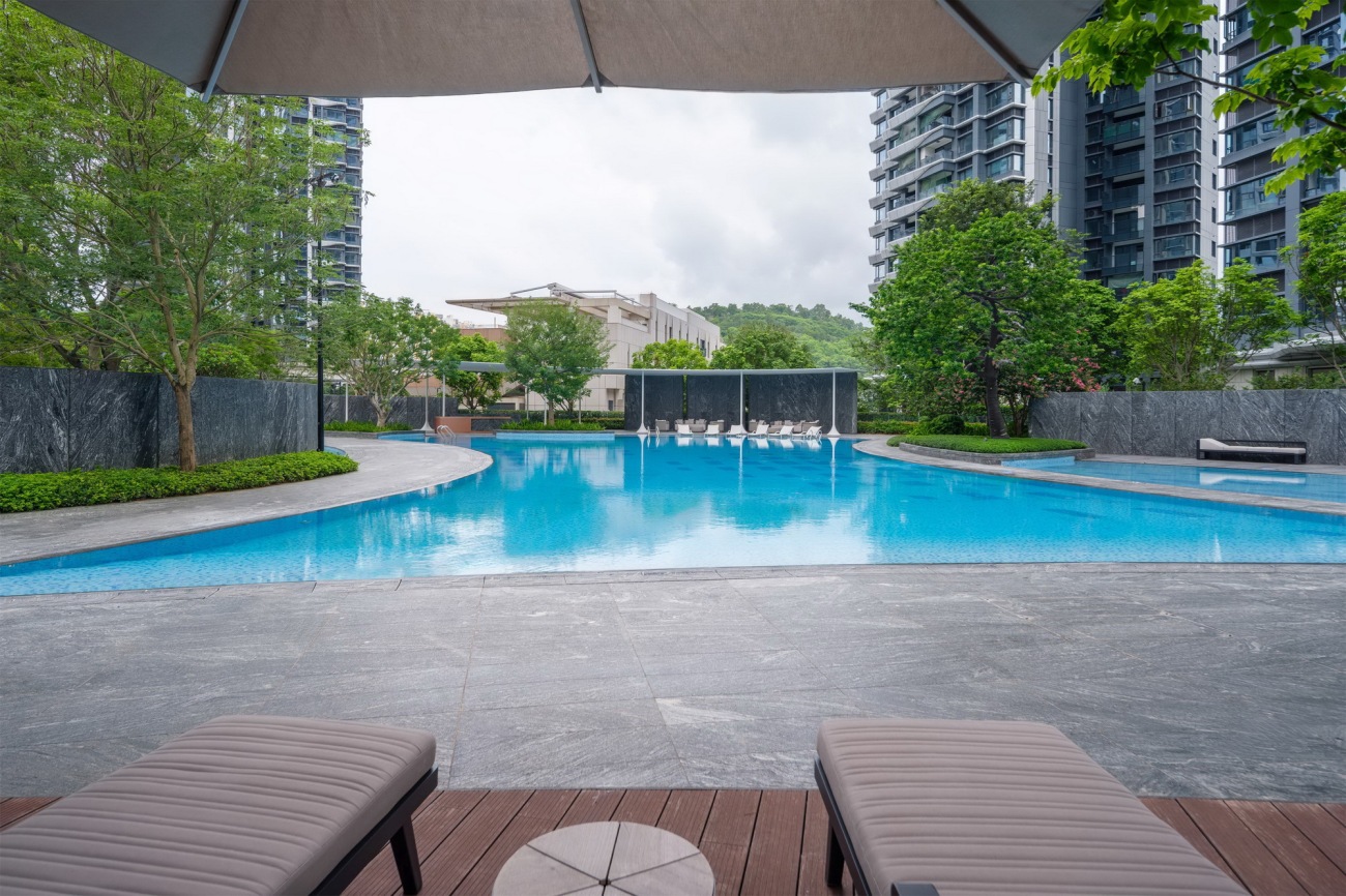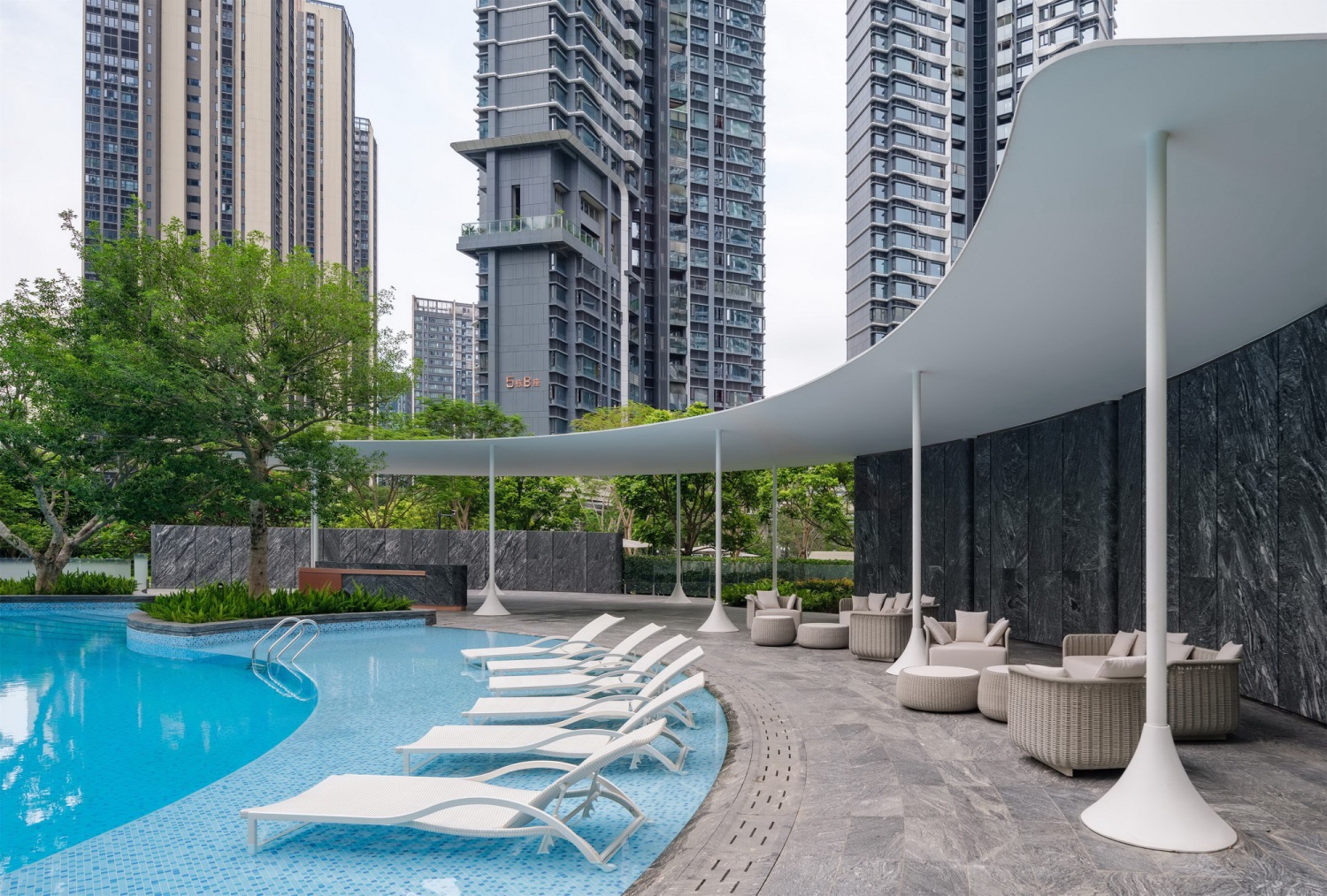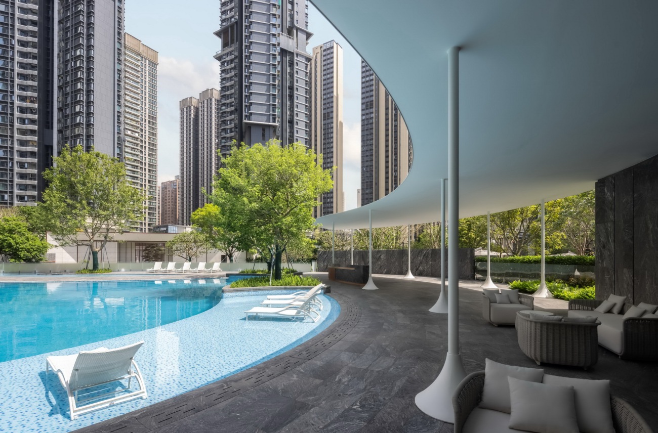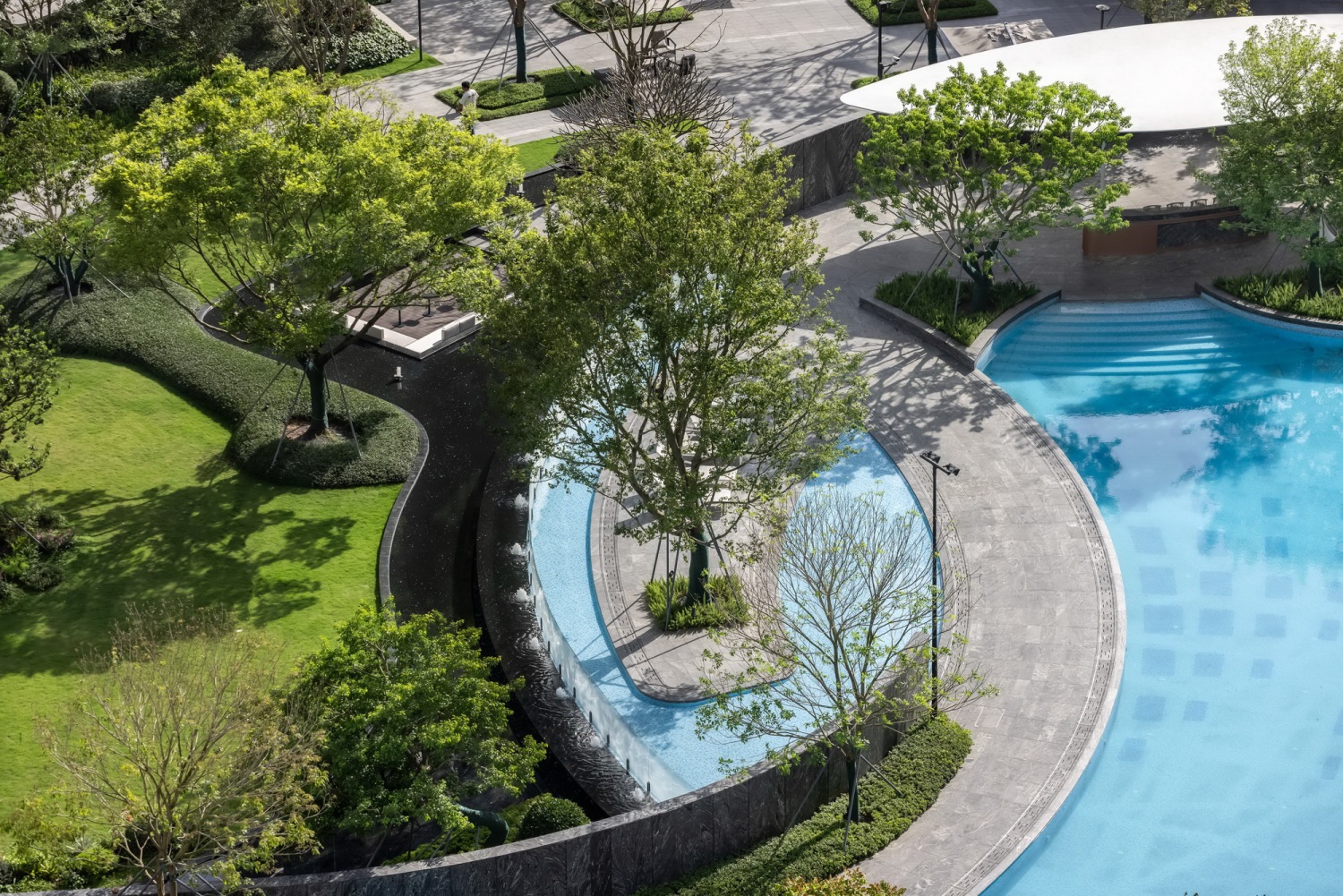 以青山水畔为灵感来源,用现代设计手法诠释东方意境,将无界泳池、休闲区与自然紧密联结,打造具有自然气韵和度假氛围的生活空间。