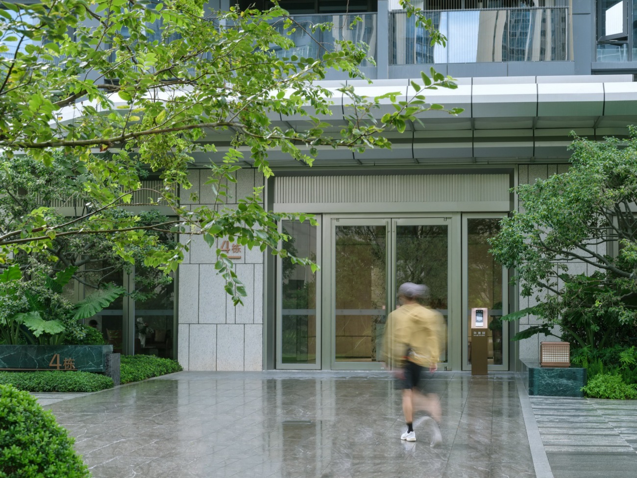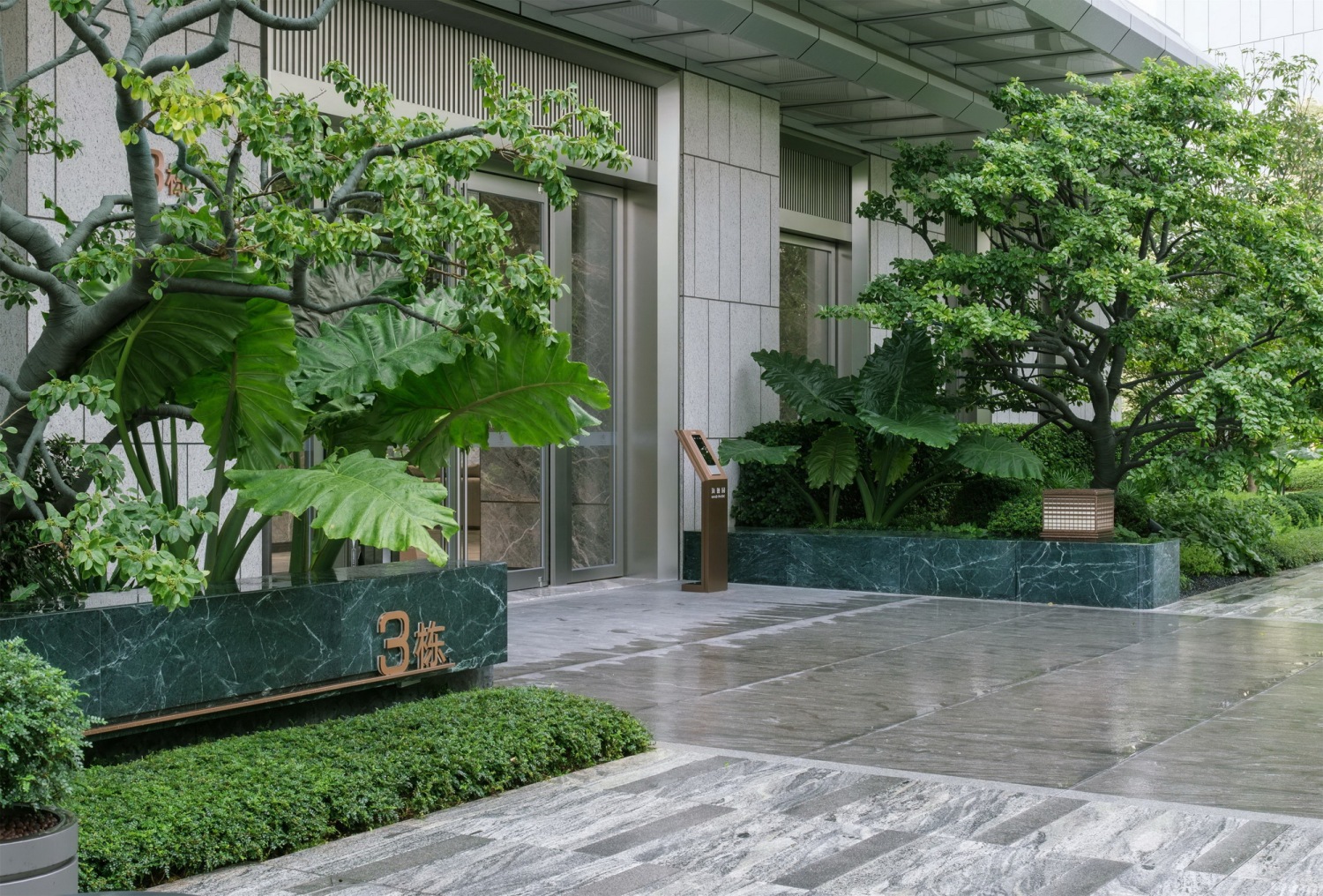 面宽约33米的奢阔酒店式门庭,以大气开放之姿,流露独具东方意蕴的人文礼序。沿途两旁如层峦叠翠的花池与迎宾水景,以「穿林越水」的自然化景观底色唤醒生活的仪式感,消弭城市与社区的内外界限感。
