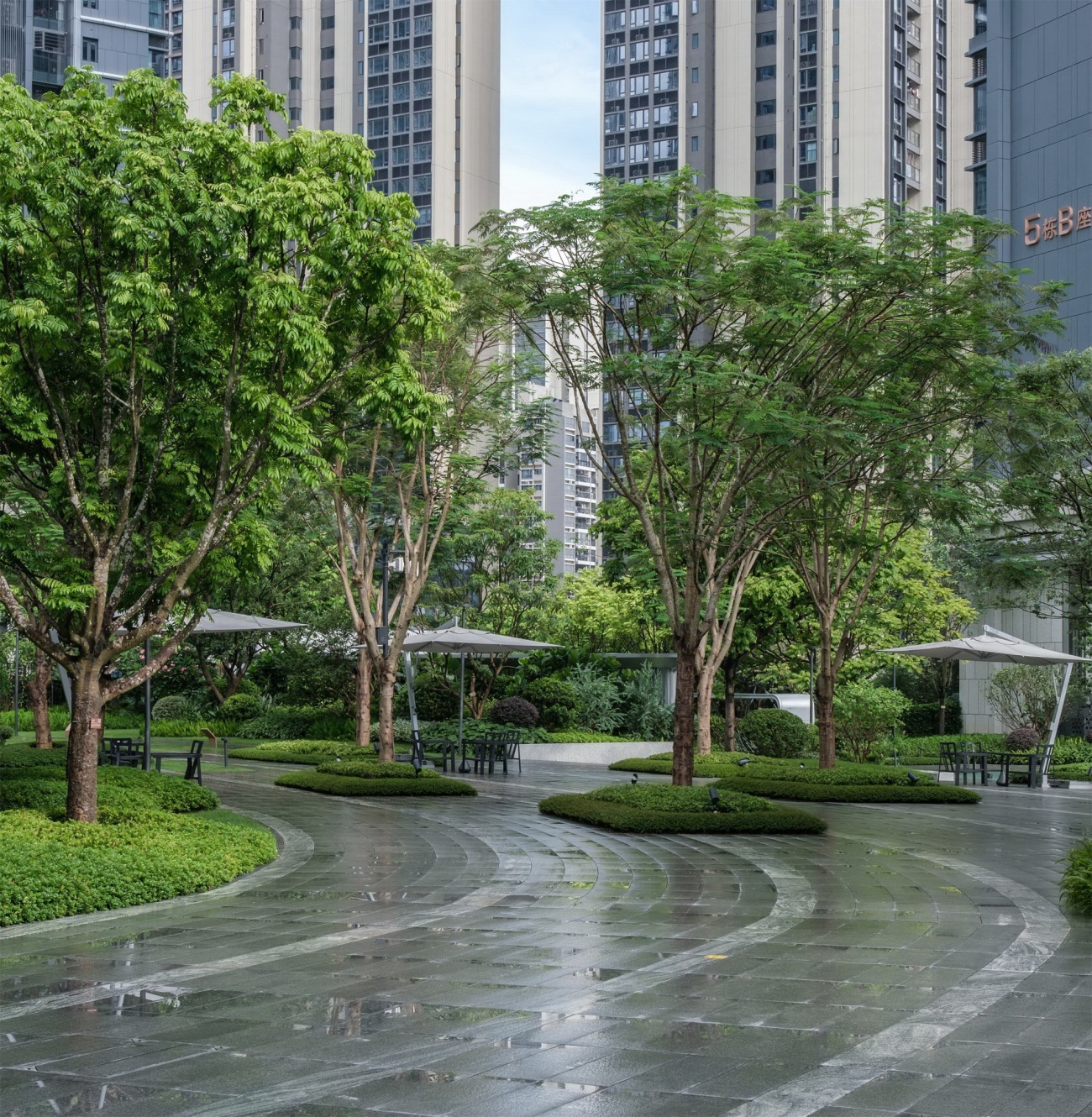 林下庭院曲线勾勒出空间的秩序感与流动感,自然花园与高分枝乔木围合营造出包裹感,搭配柔软的户外家具,置身其中,感受绿意环绕、阳光充盈的静谧舒适。
