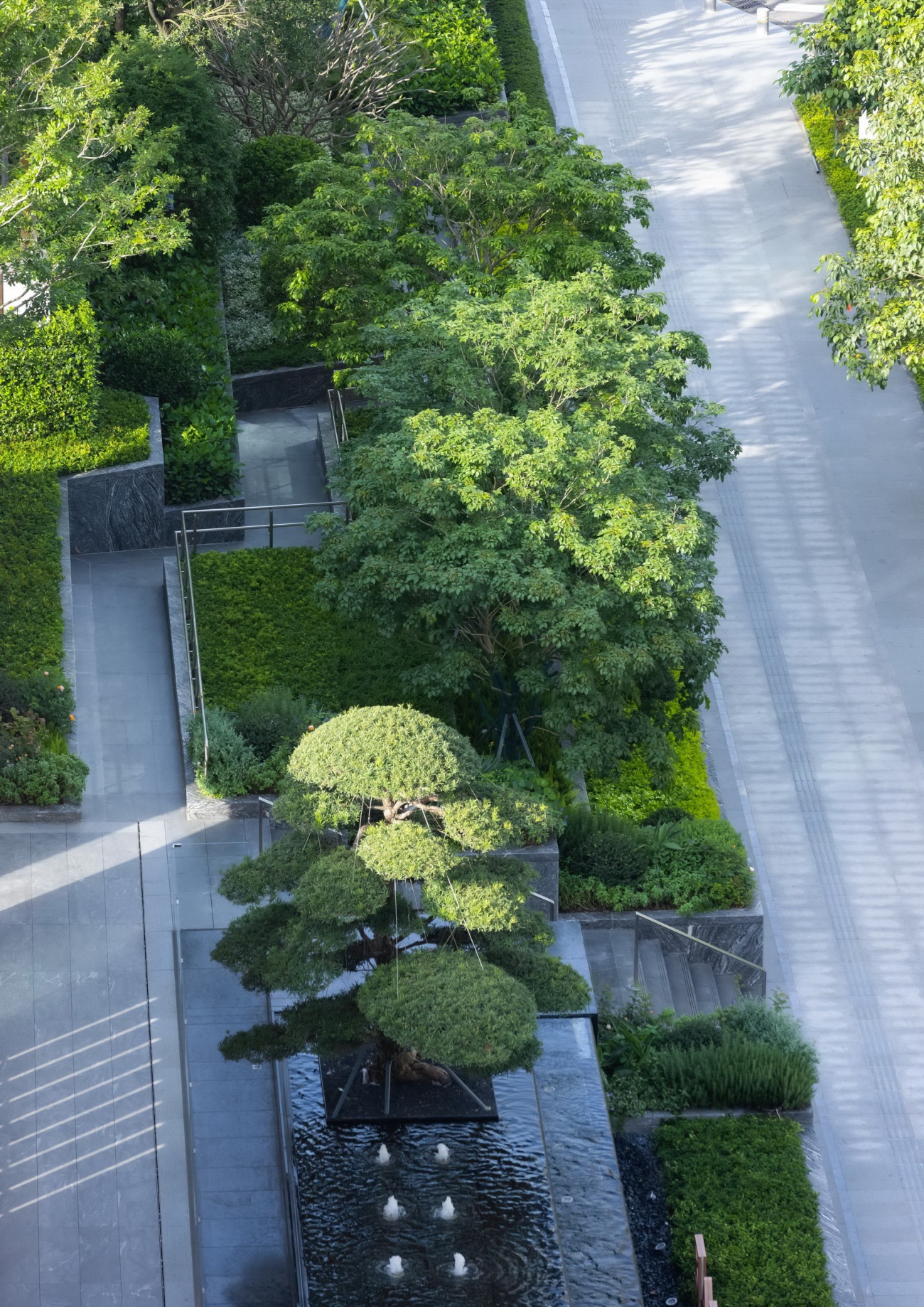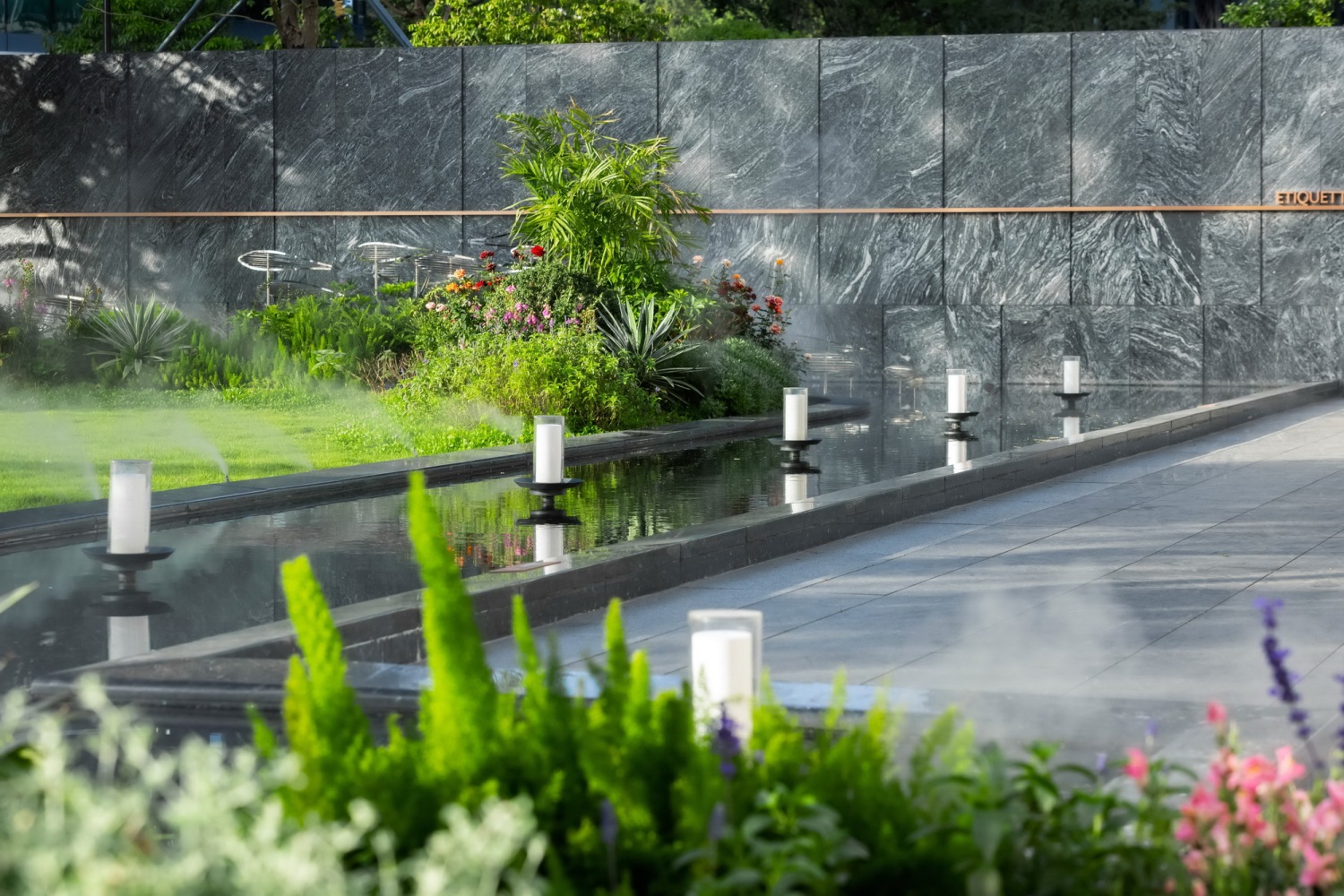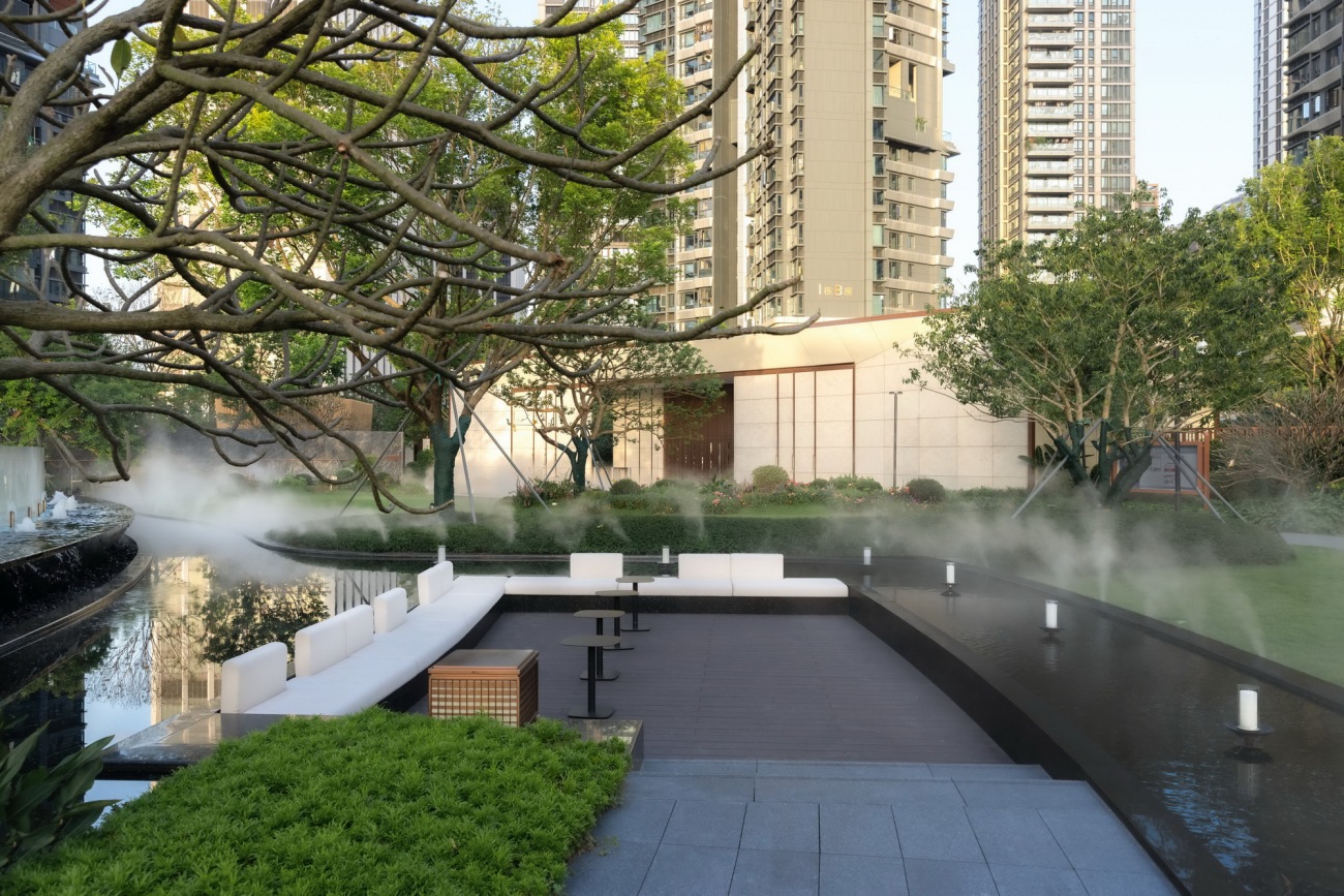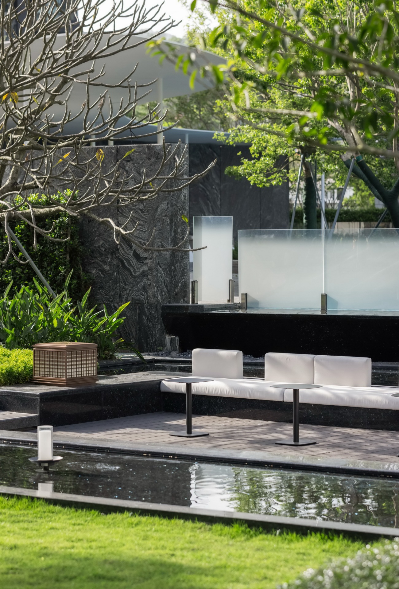 对景庭院镜面水景将绿地环绕,并与中心功能水景交融,方寸之间,曲水蜿蜒,宛如山水画卷铺陈眼前,灵动而隽永。