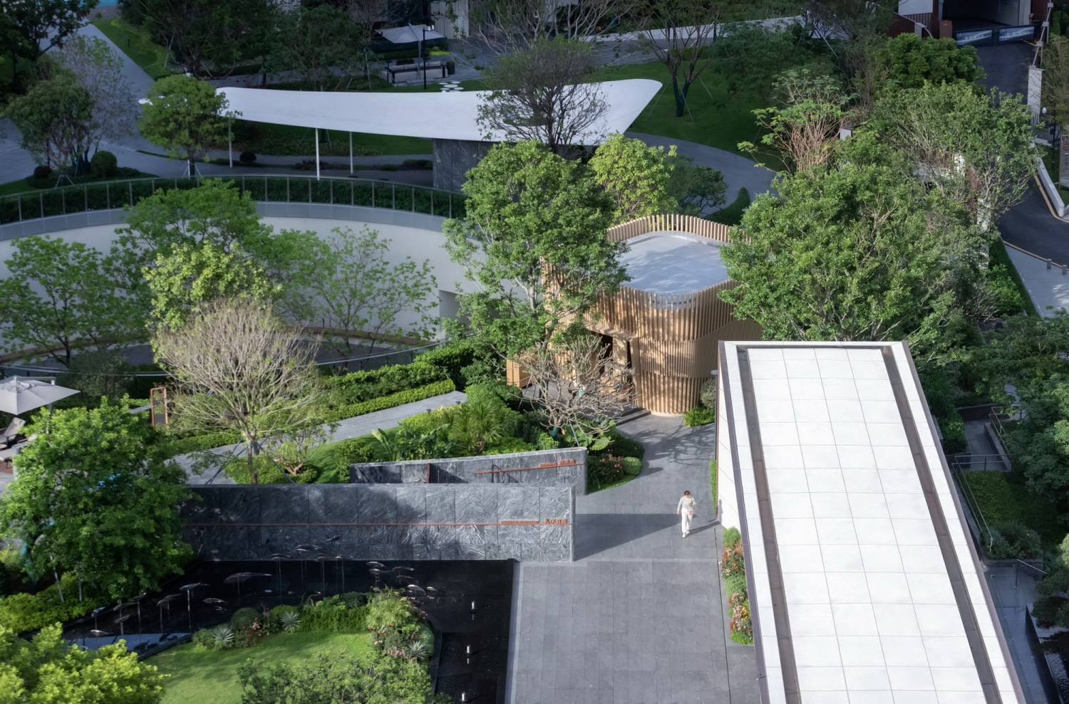 休闲区考虑空间的私属感,通过静水、林木、景墙的结合,形成层叠交织的半围合空间,构筑东方韵味的森系水院氛围。