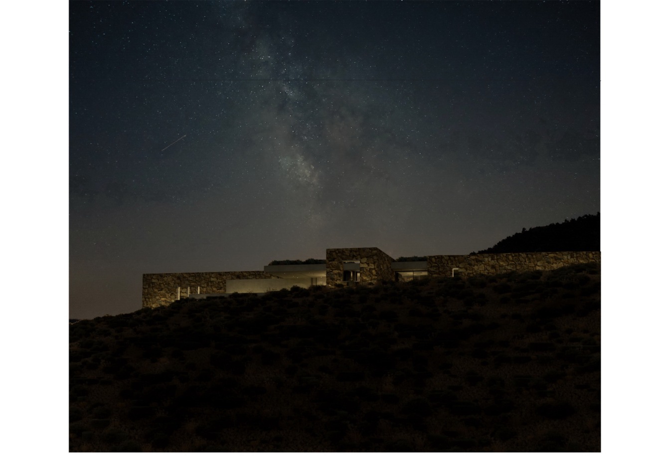 住宅坐落于希腊锡罗斯岛陡坡之上,俯瞰爱琴海。230平方米的建筑部分嵌入大地,让地形自然塑造建筑形态与性能。场地开挖的石材用于结构墙与覆层,强化建筑与土地的物料联结。设计采用再生木材、清水混凝土与本土植被,形成低碳且根植于当地的材料语汇。