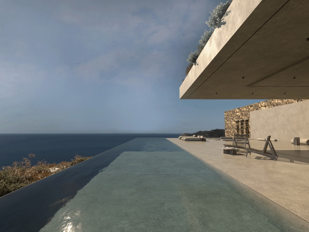 建筑沿水平轴线展开,室内空间南向布局,在引入无遮挡海景的同时最大化被动式太阳能获益。受庇护的北立面减少盛行风影响并提升热舒适性。L形泳池界定户外空间,辅助被动冷却,并通过视觉连接强化建筑与地形的呼应。