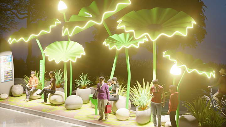 该提案以江南文化中的荷叶为灵感来源,希望出现在山水画中的荷也可以出现在嘉兴市民的生活场景中。由此,我们采取的设计概念是将荷叶放大到驿站的尺度,从而创建一片为城市公